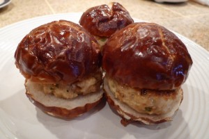 But anyway, it is a fitting title for this post because R made teriyaki chicken sliders for dinner last night, the second invention with his new meat grinder. Um, holy awesome!! These were some of the best mini-sandwiches I’ve ever had. They were made of ground chicken breasts, green onions, garlic, ginger, and real soy sauce, topped with cherry horseradish mustard, and served on pretzel dinner rolls.