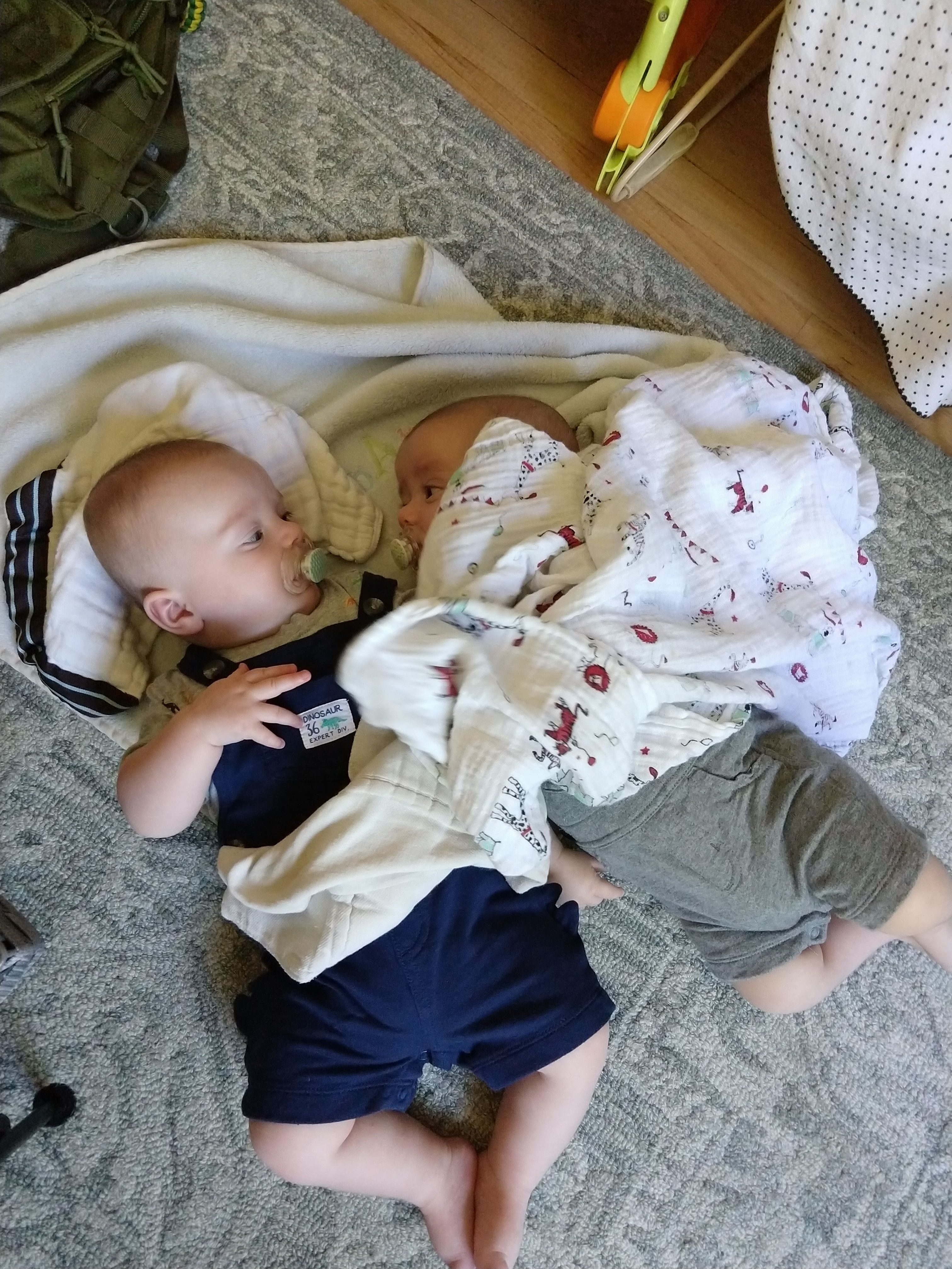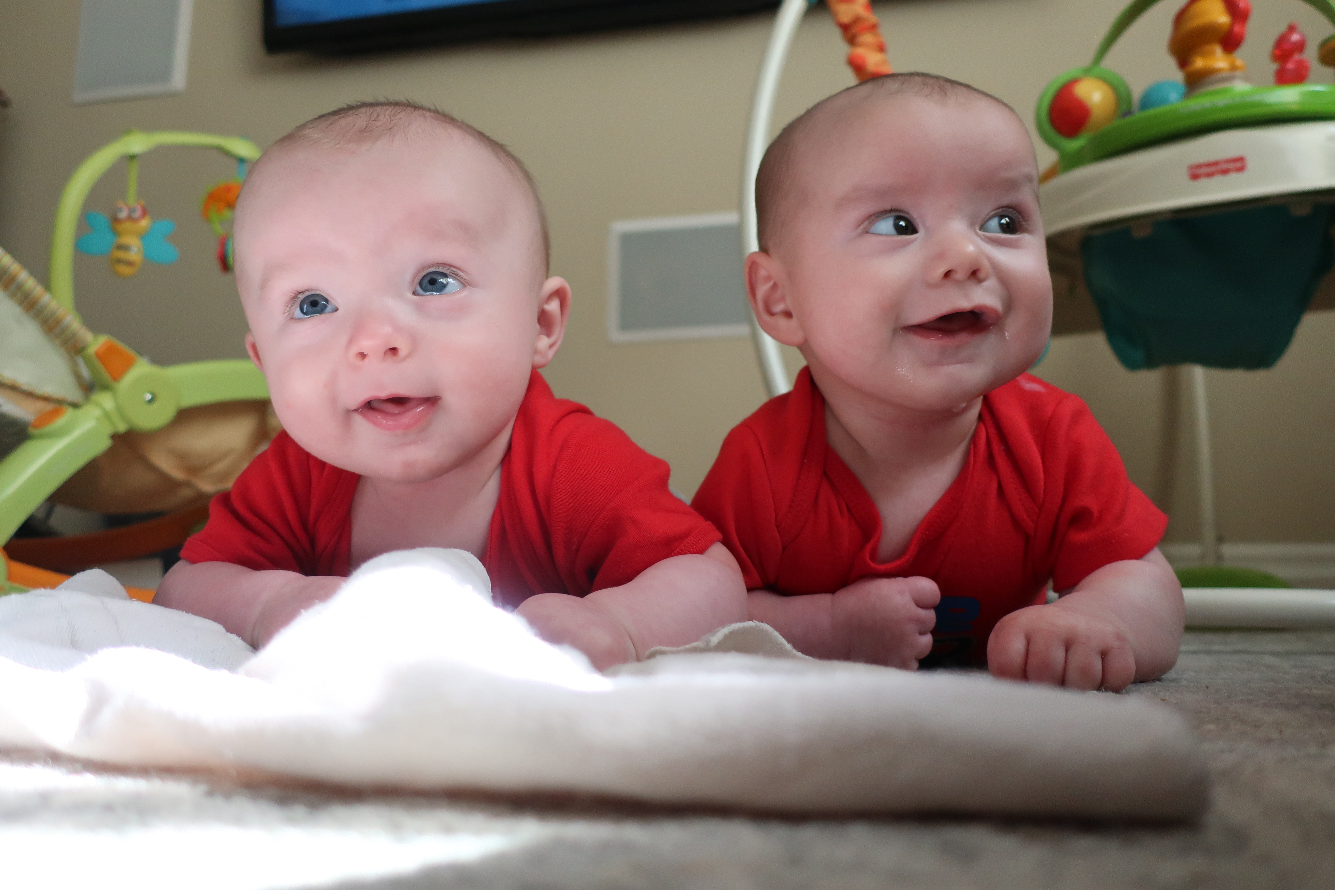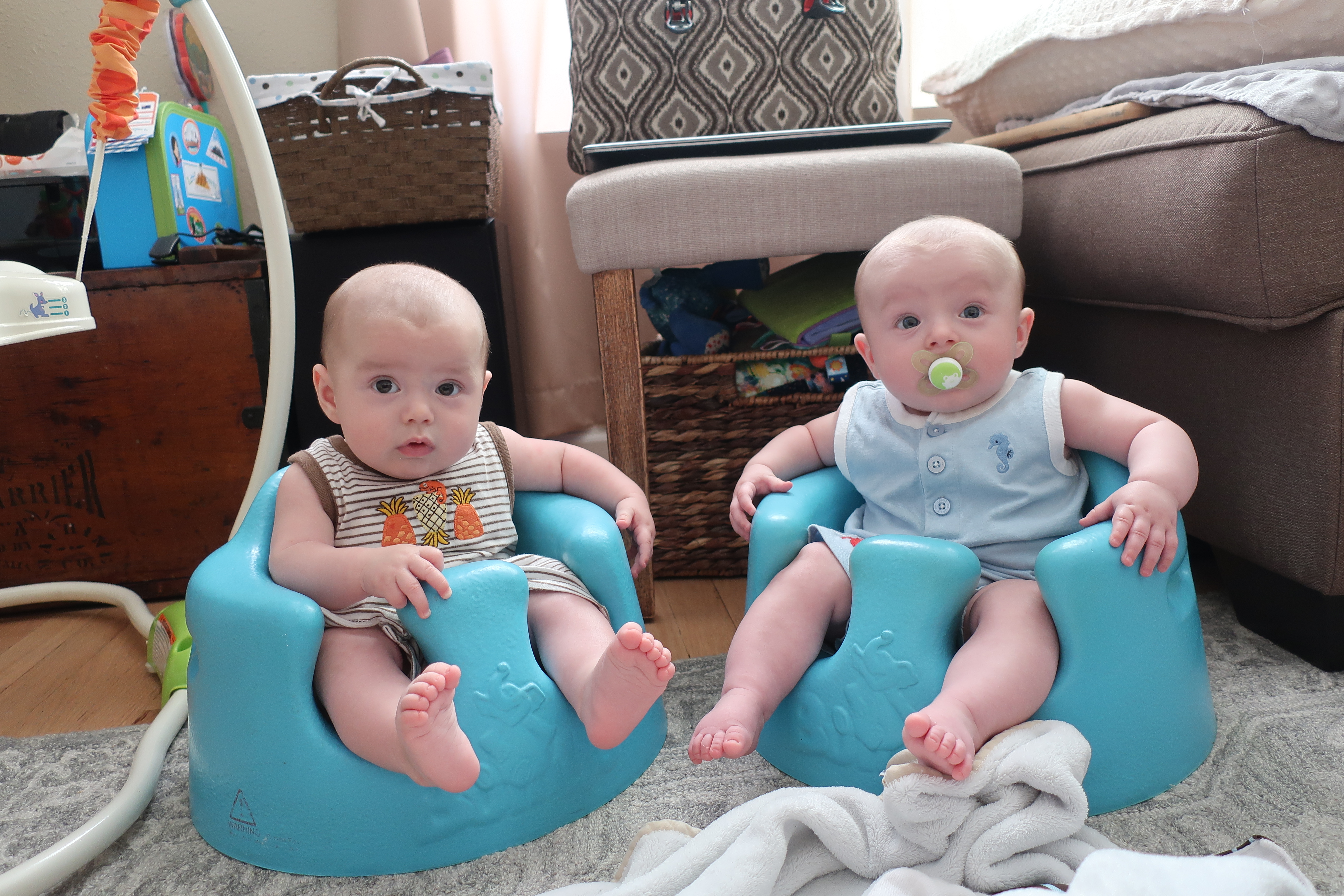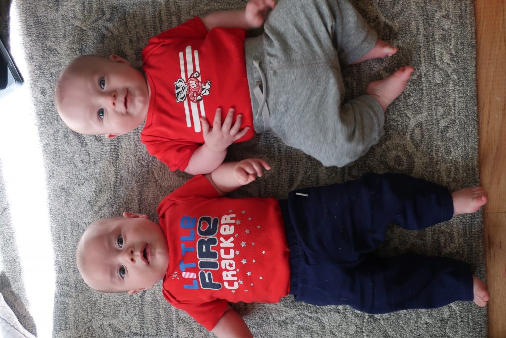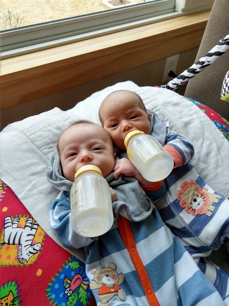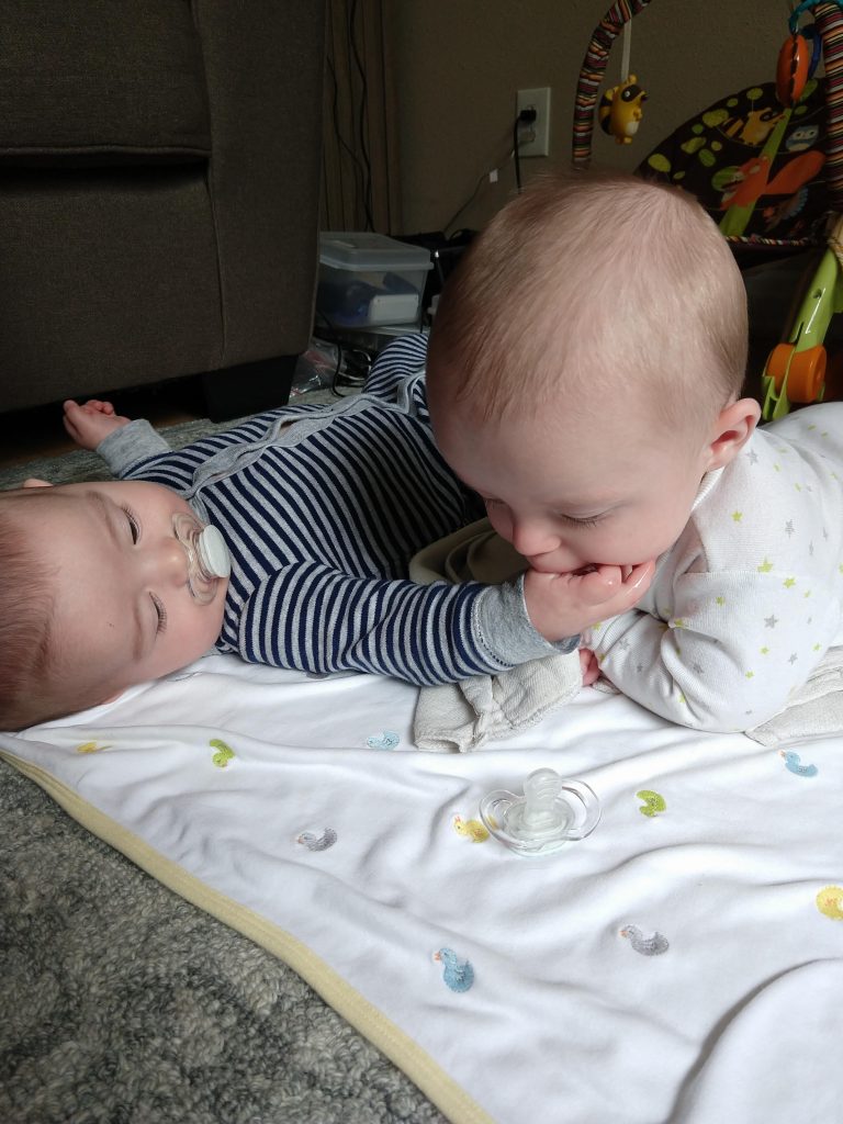 They both have their bottom front 2 teeth and got those about a month ago. And they instantly started biting me with them while nursing, so that’s super fun. Fortunately I only nurse them once overnight and sometimes once around wake-up time now with bottles of pumped milk and formula throughout the day, but that still hurts when it happens!