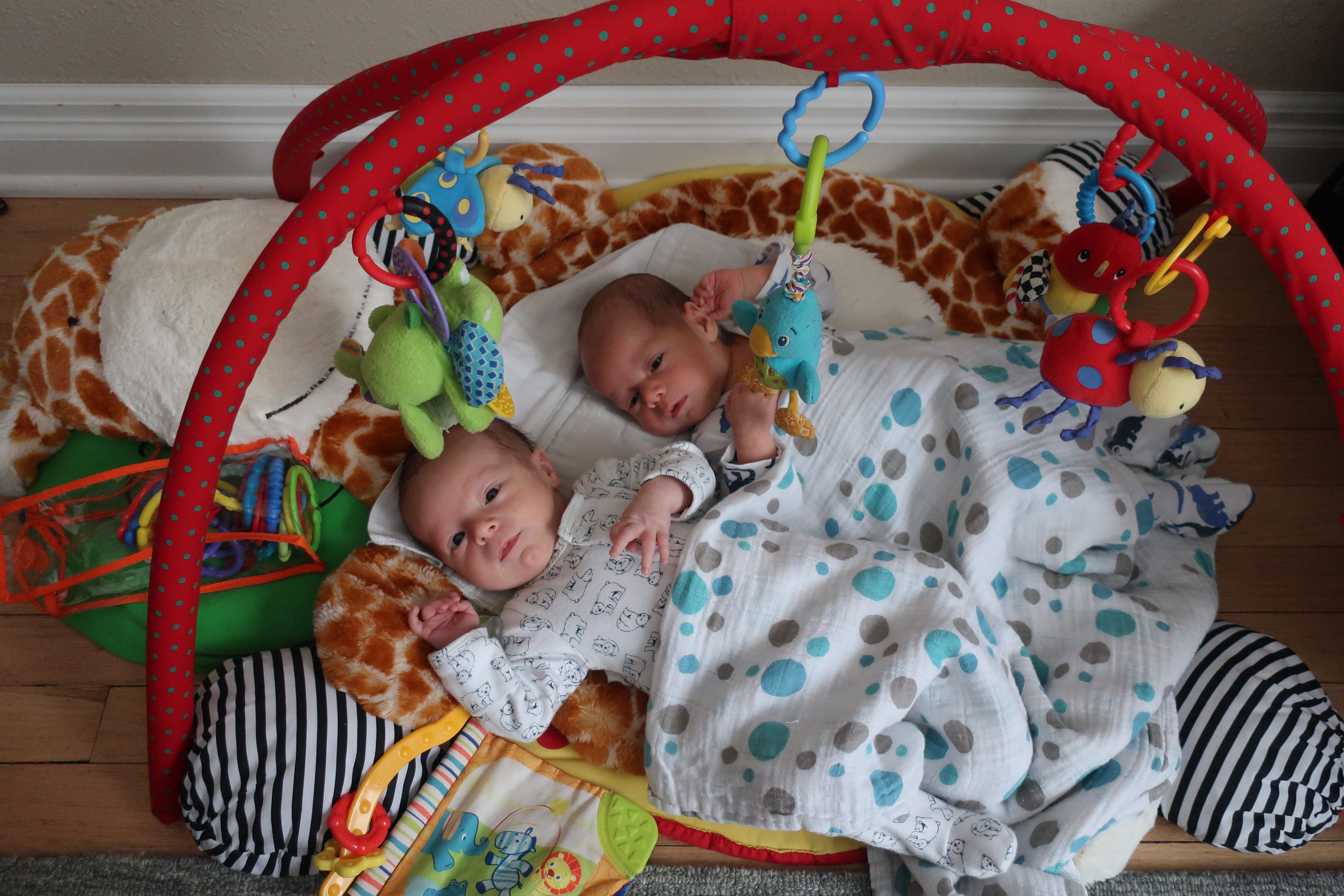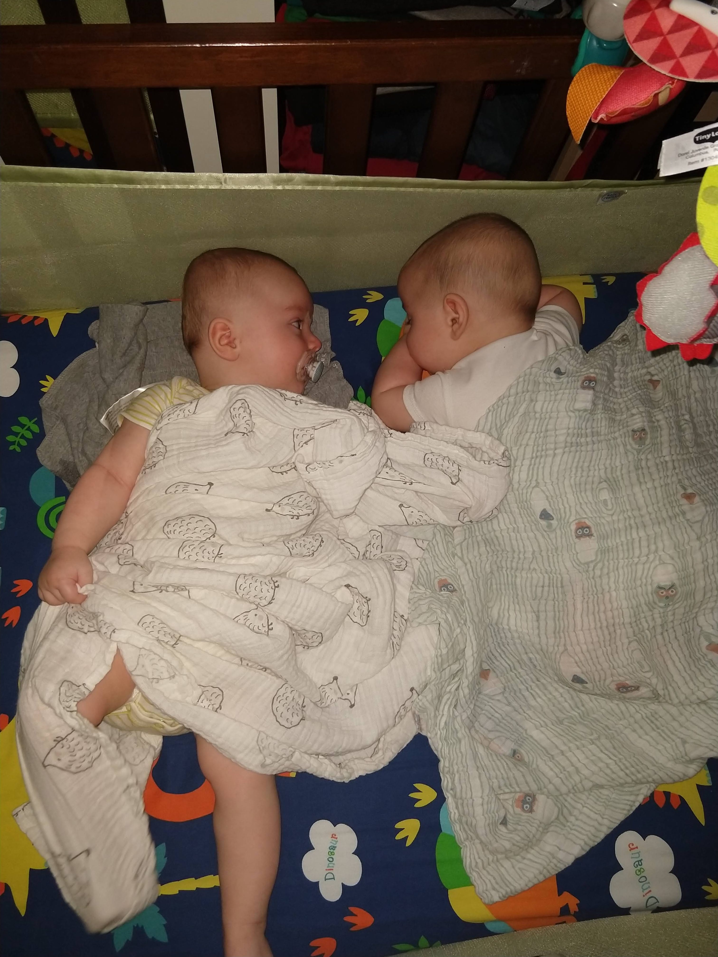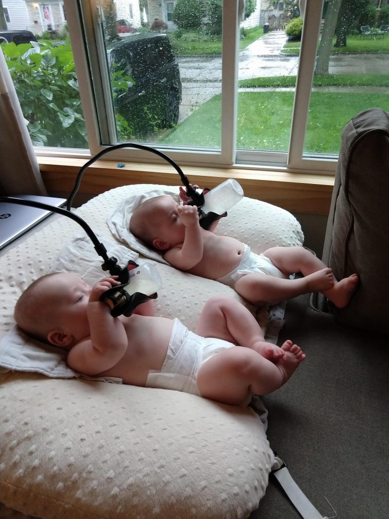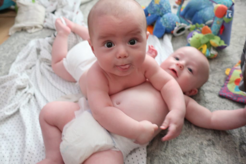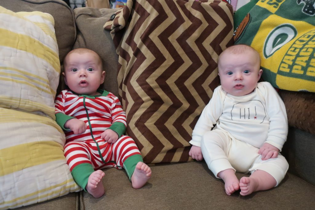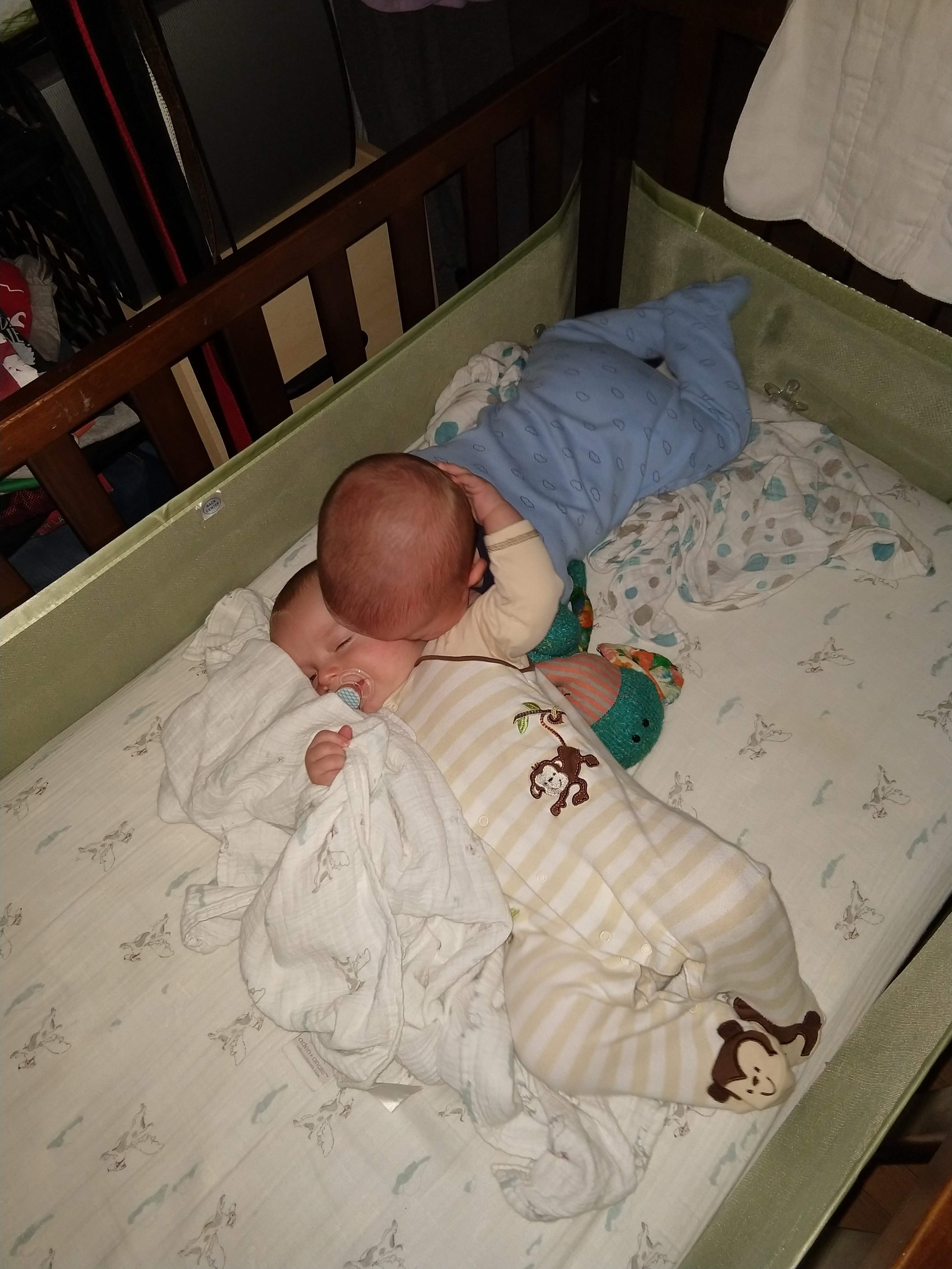 They both have their bottom front 2 teeth and got those about a month ago. And they instantly started biting me with them while nursing, so that’s super fun. Fortunately I only nurse them once overnight and sometimes once around wake-up time now with bottles of pumped milk and formula throughout the day, but that still hurts when it happens!