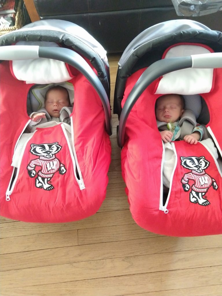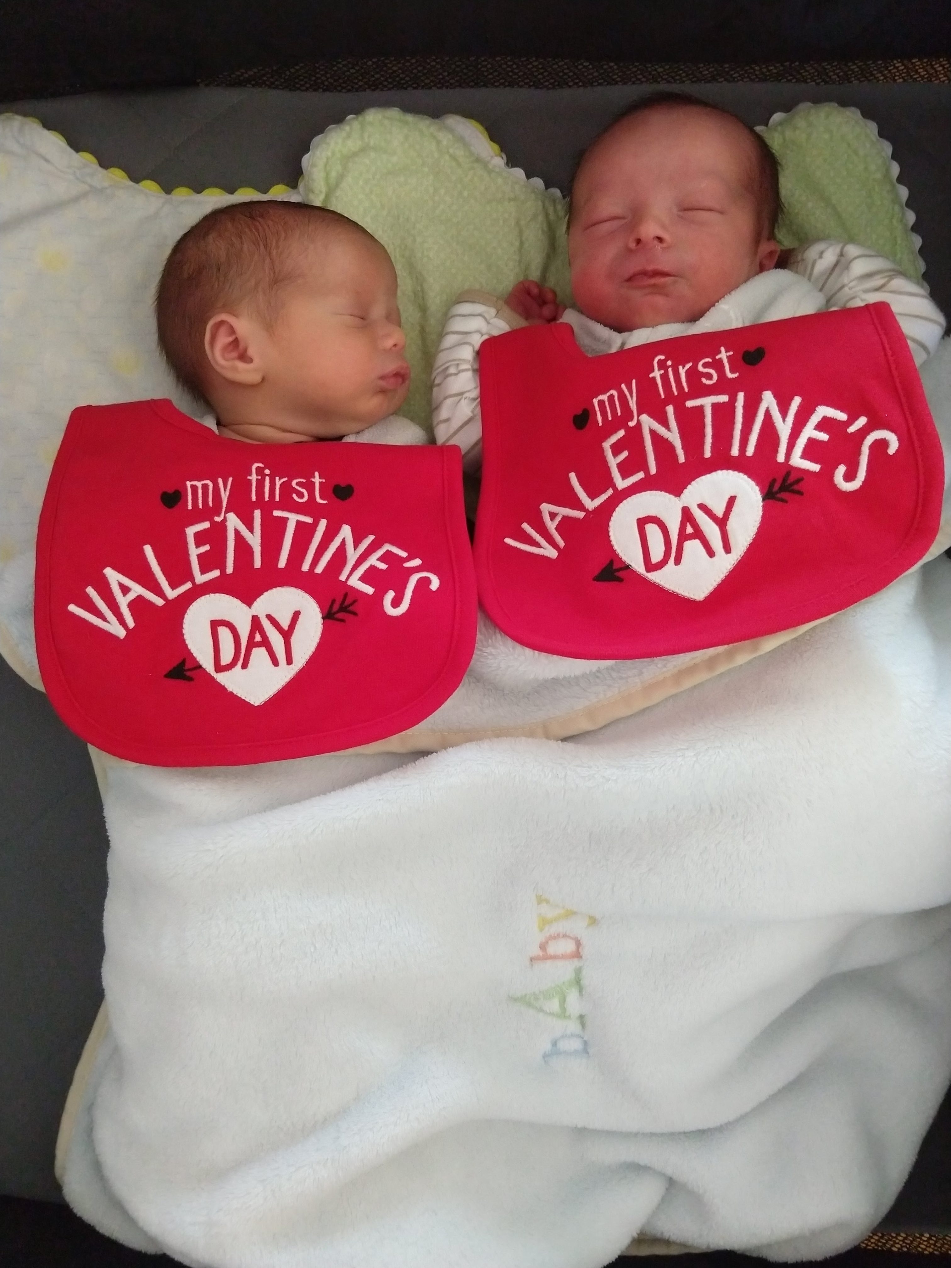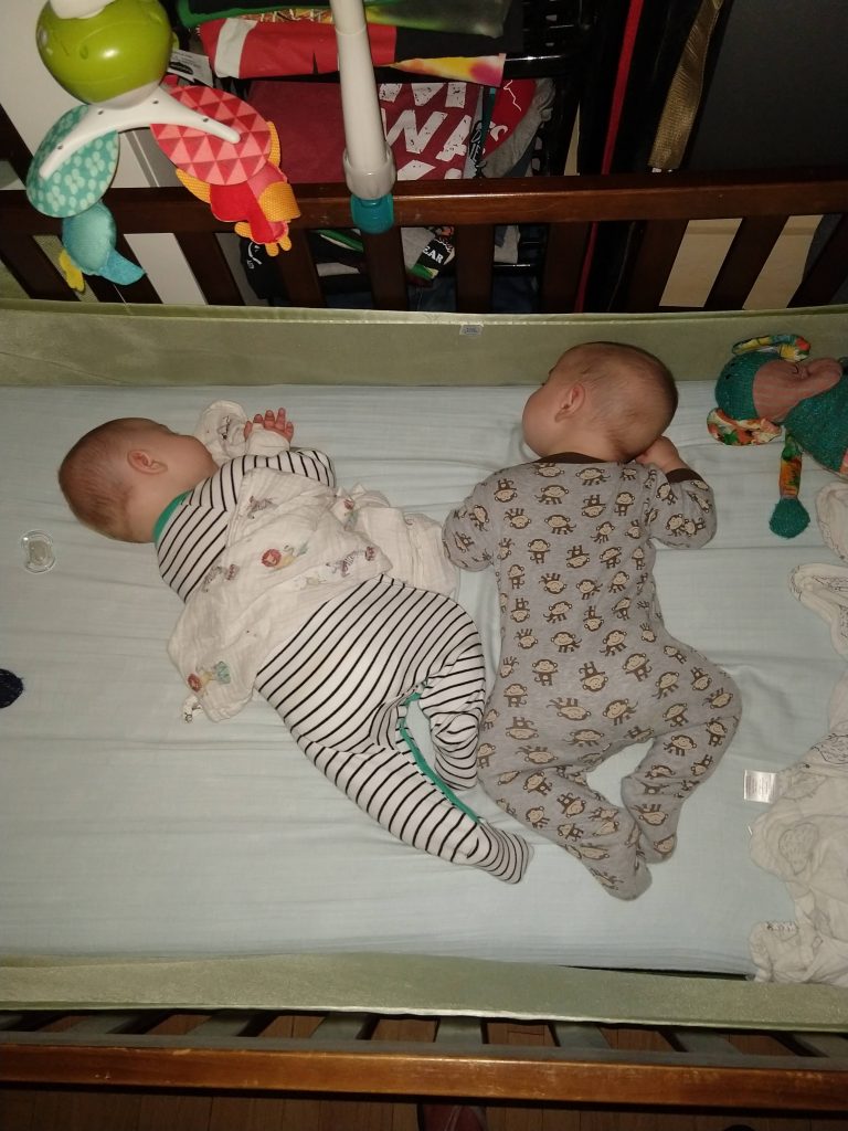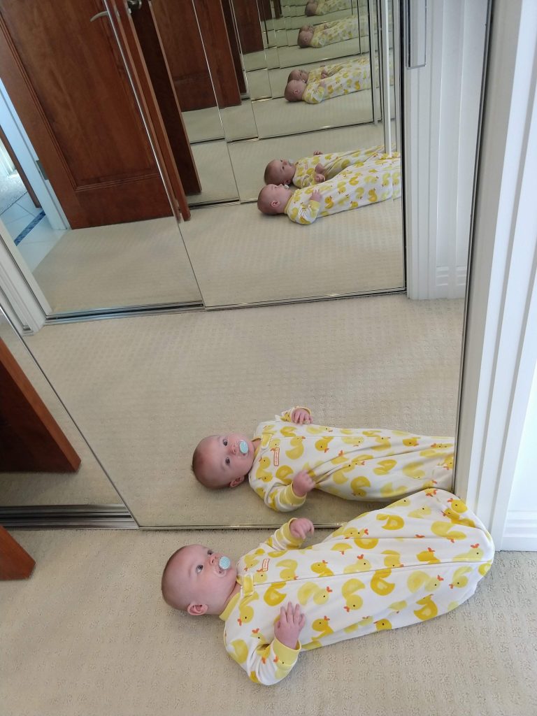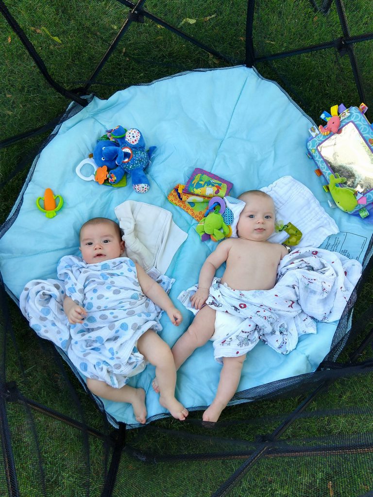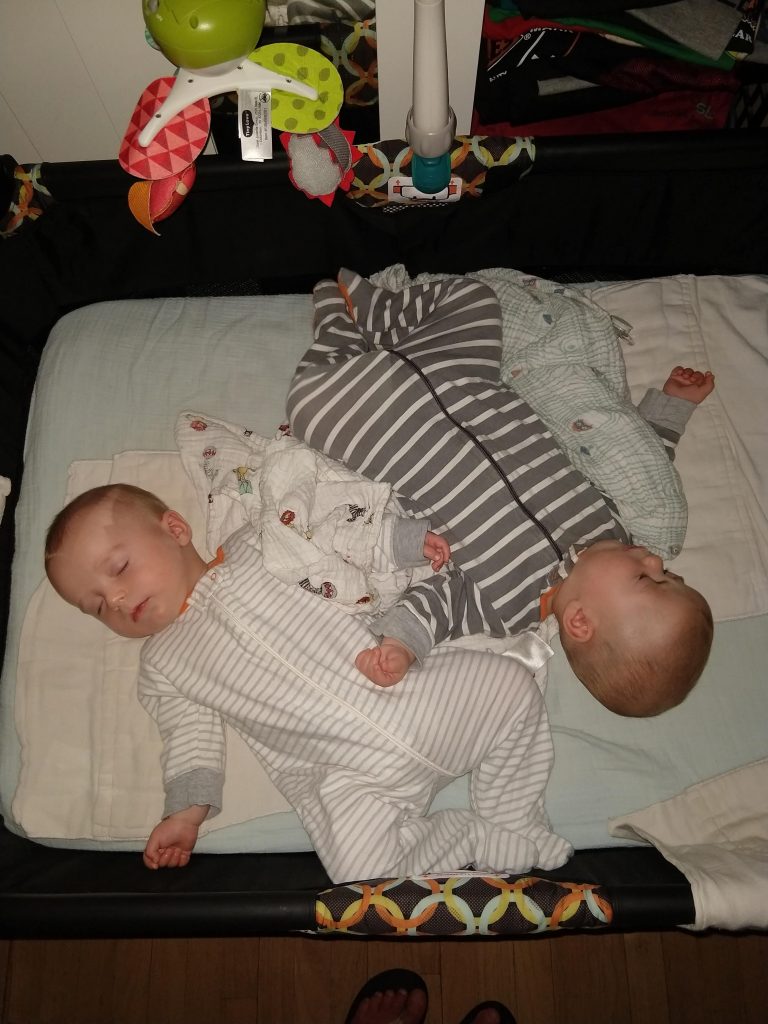 They both have their bottom front 2 teeth and got those about a month ago. And they instantly started biting me with them while nursing, so that’s super fun. Fortunately I only nurse them once overnight and sometimes once around wake-up time now with bottles of pumped milk and formula throughout the day, but that still hurts when it happens!