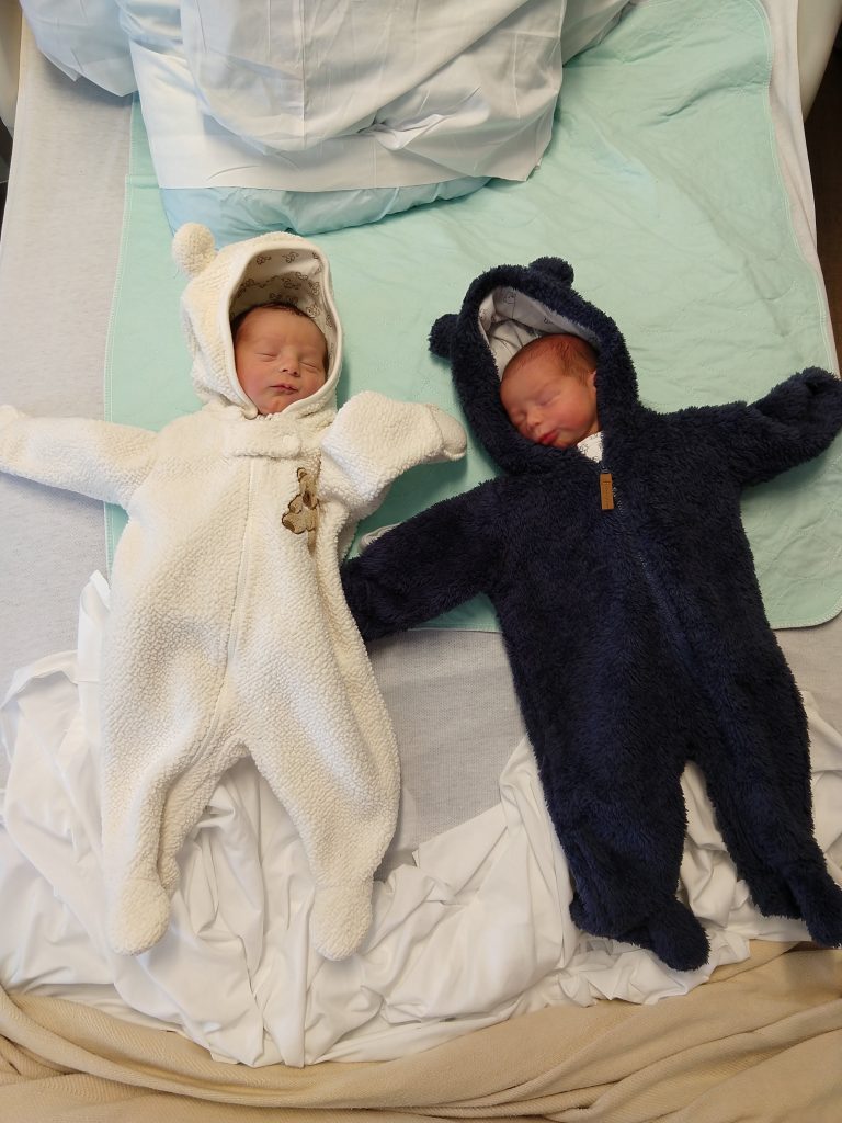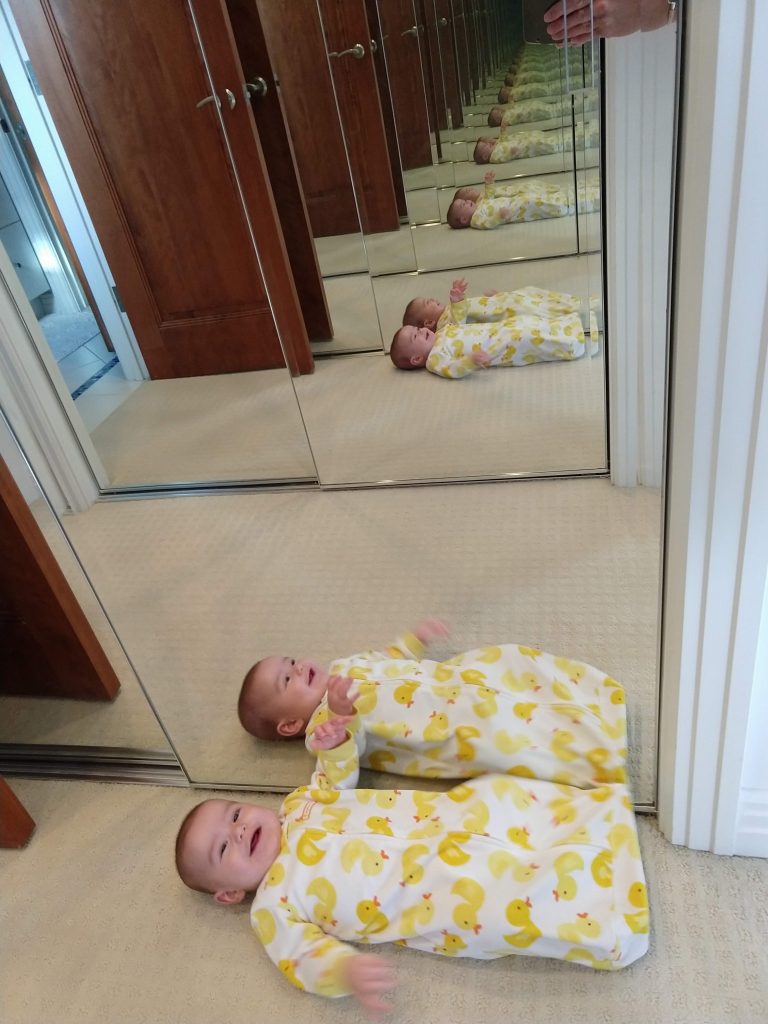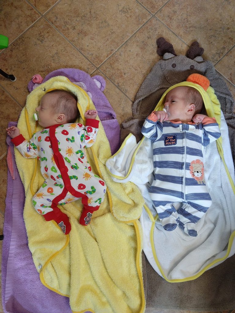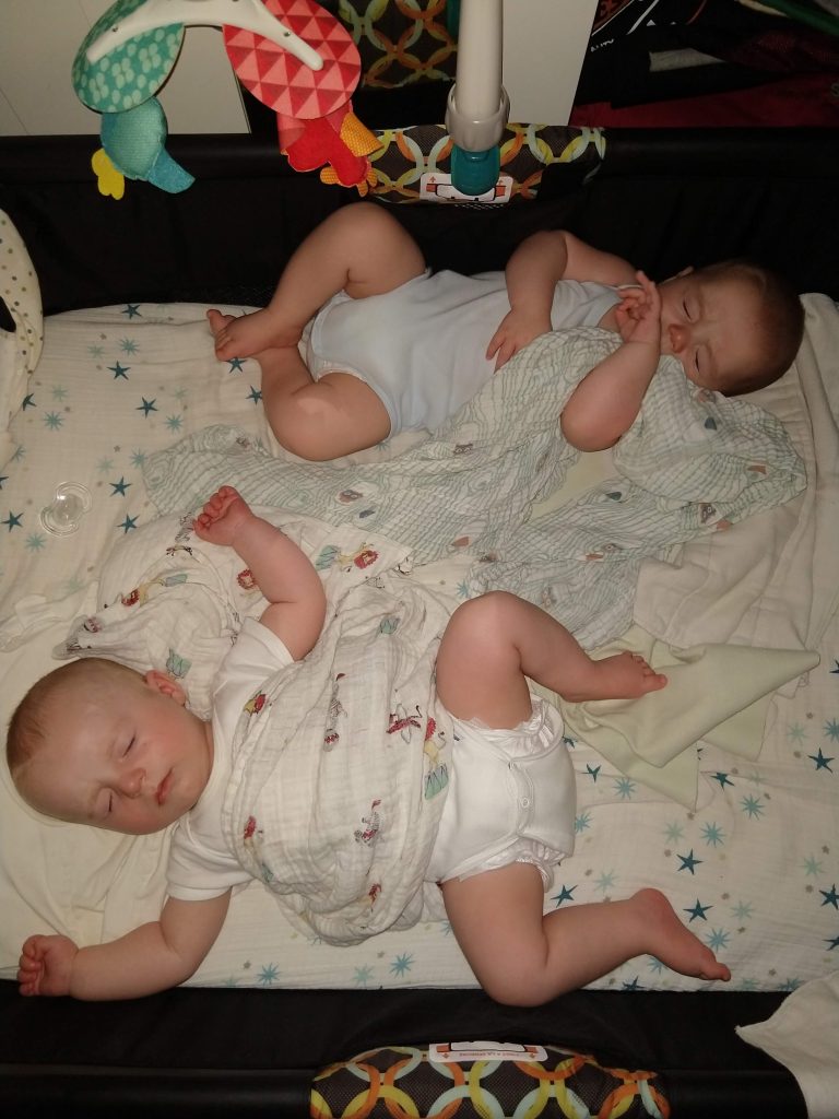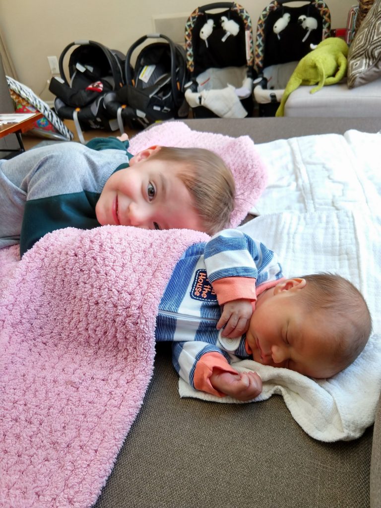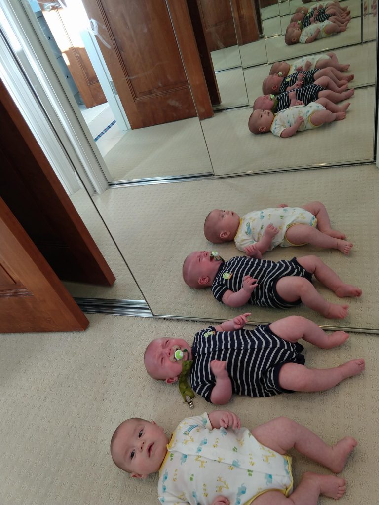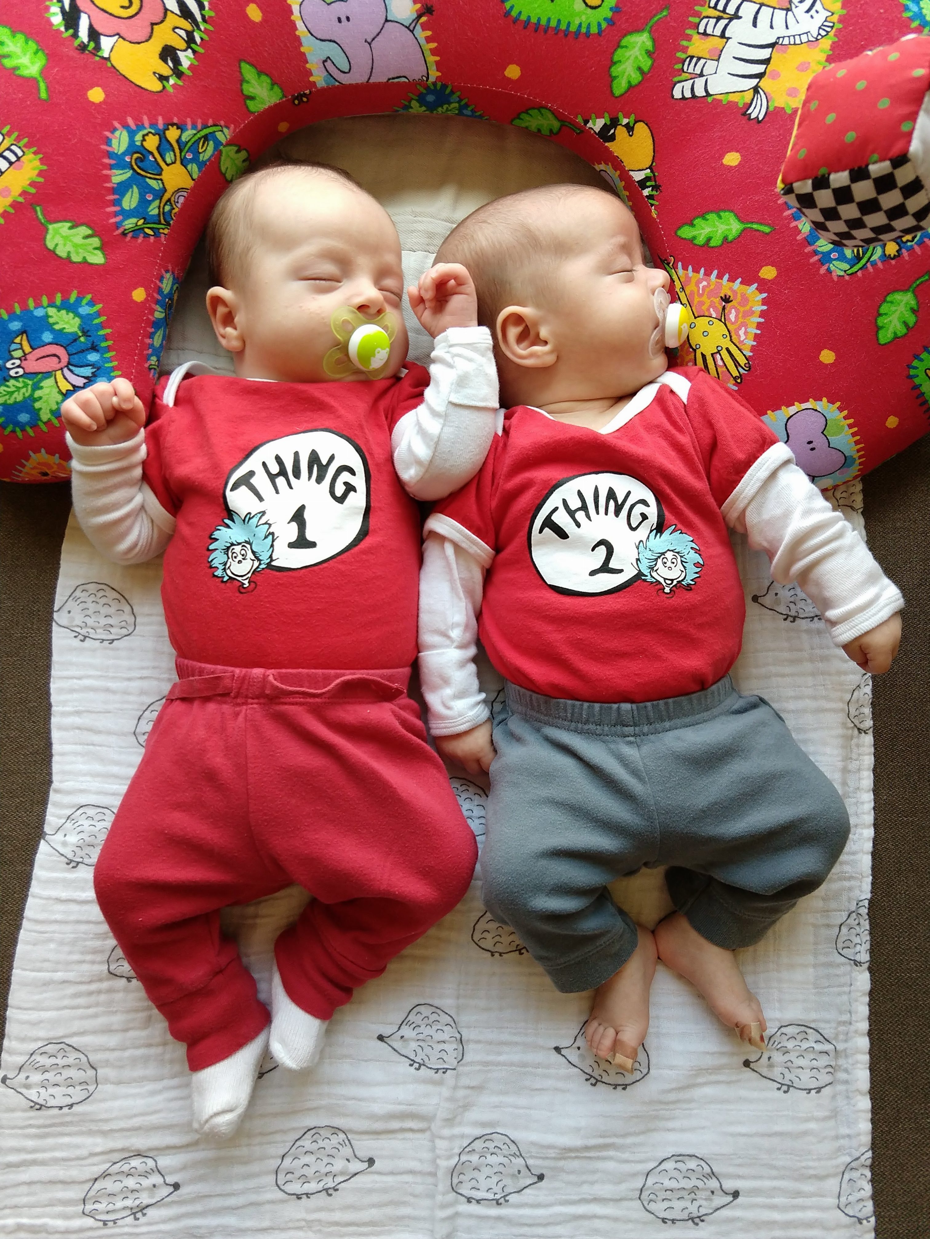 They both have their bottom front 2 teeth and got those about a month ago. And they instantly started biting me with them while nursing, so that’s super fun. Fortunately I only nurse them once overnight and sometimes once around wake-up time now with bottles of pumped milk and formula throughout the day, but that still hurts when it happens!