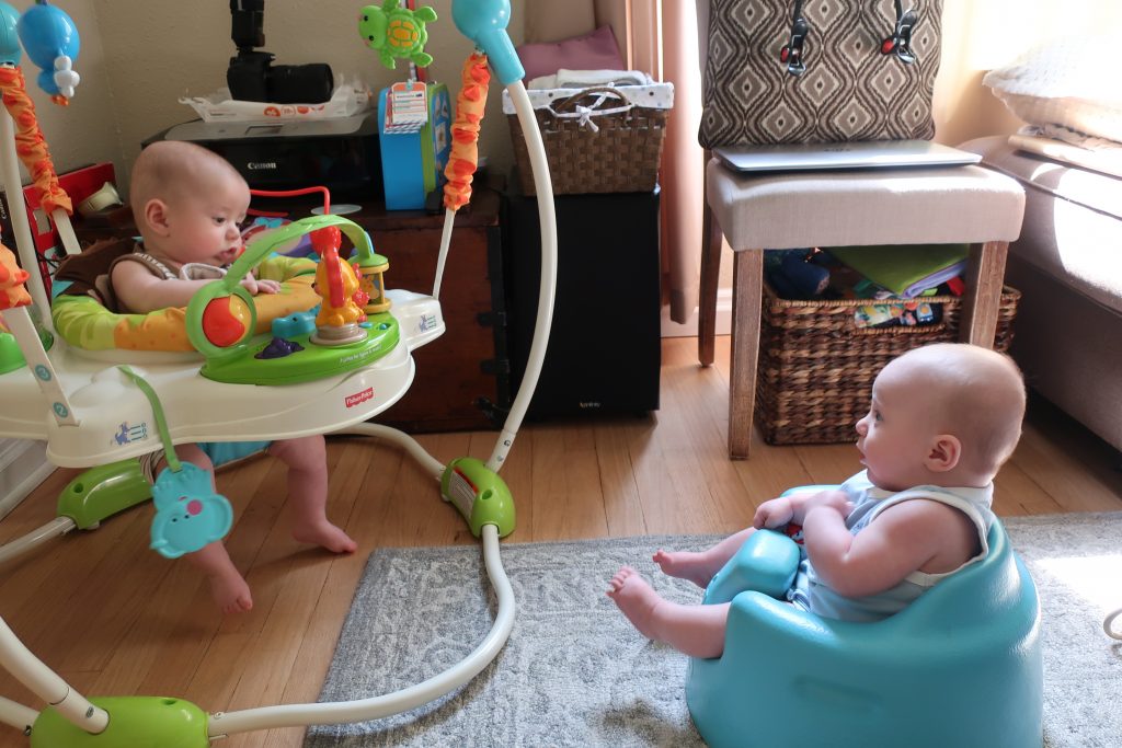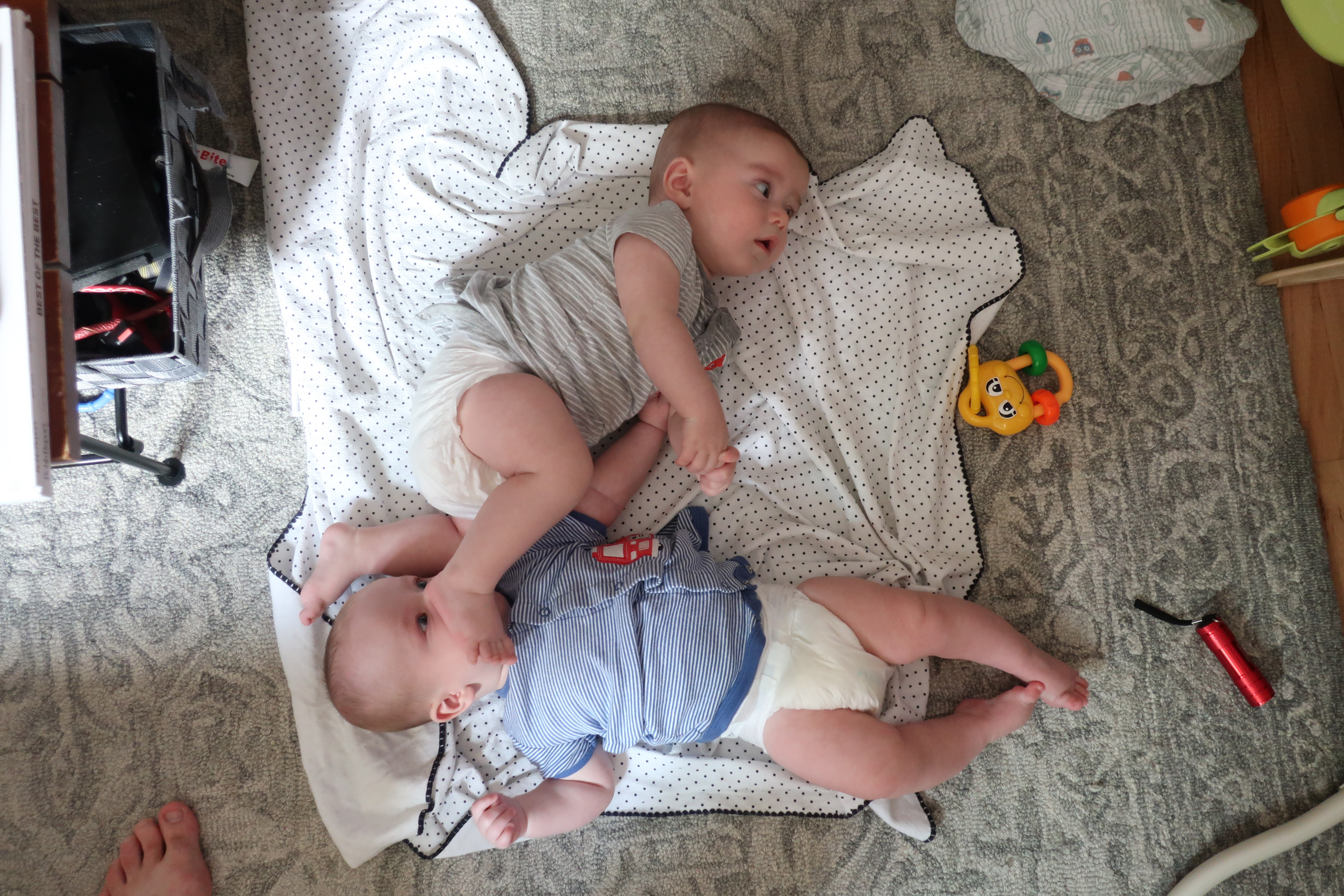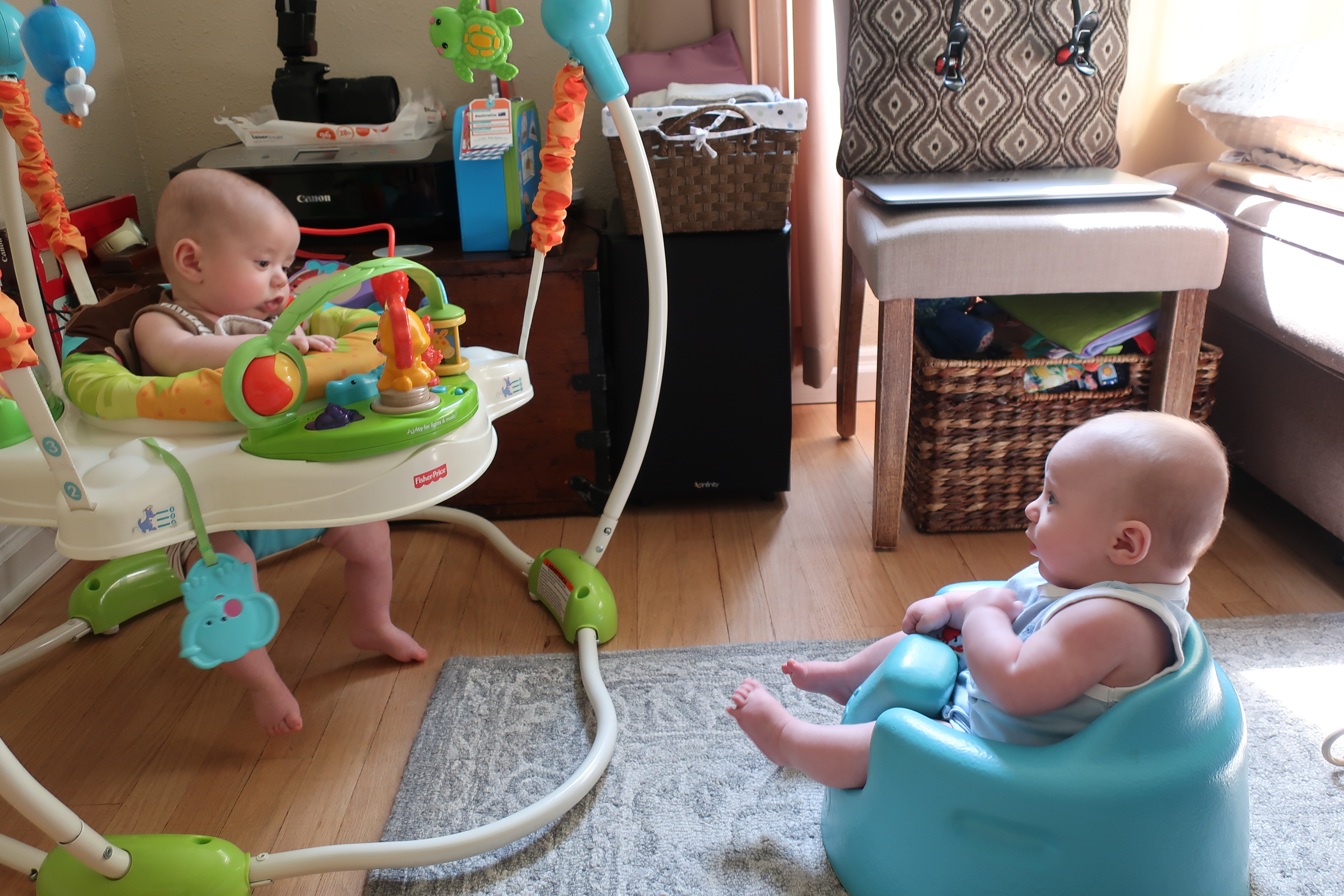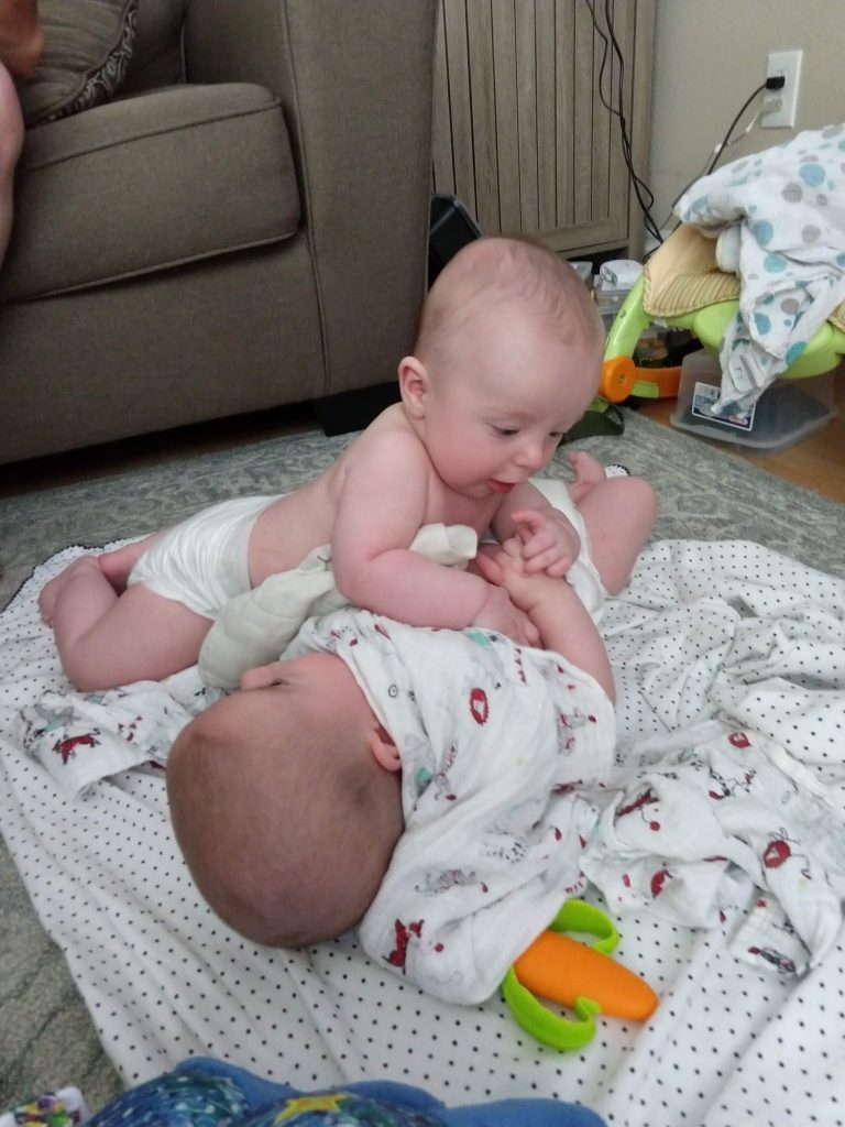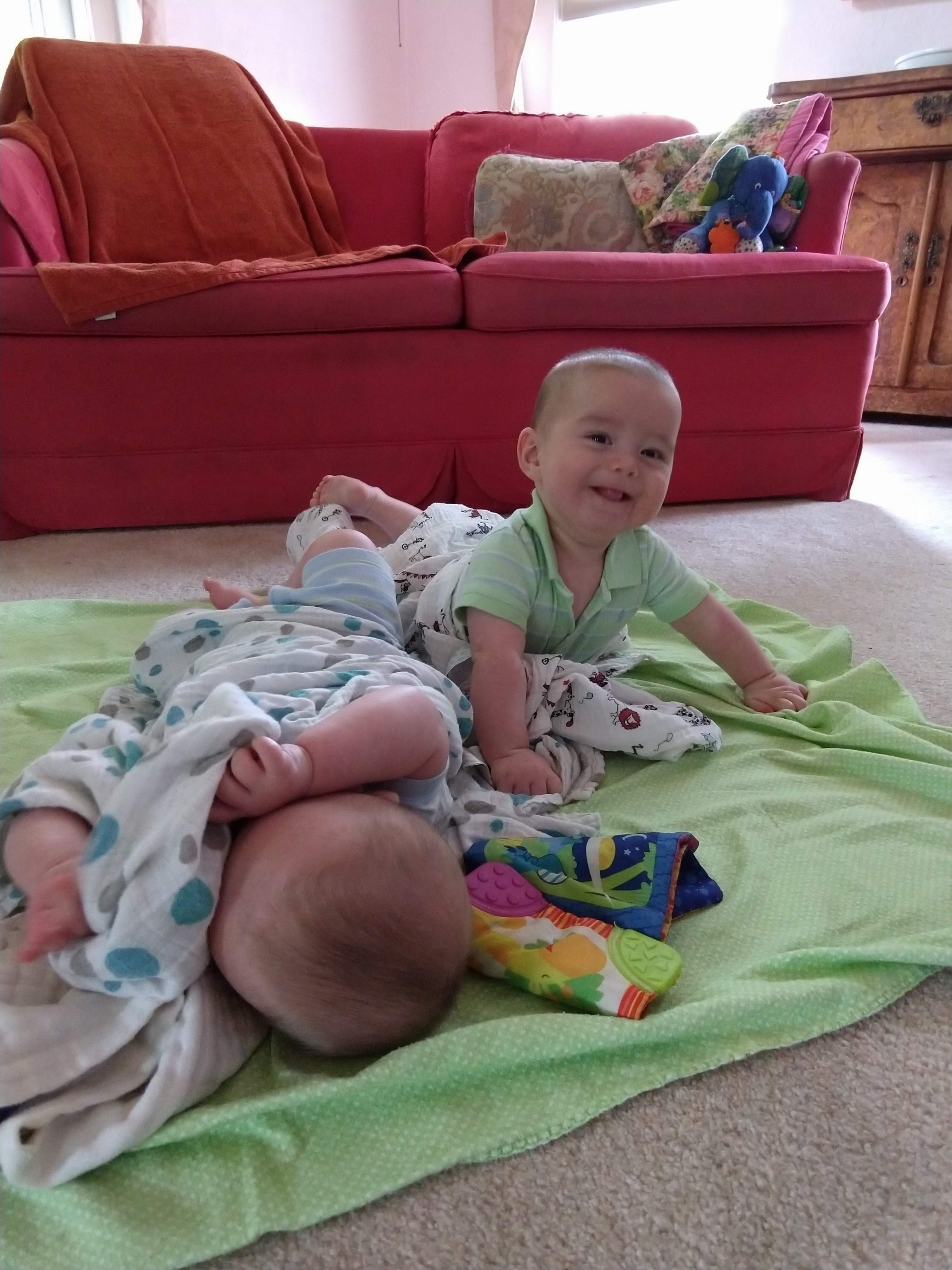 We can already see that these two have distinctly different personalities. Avit is pushing himself up to sitting (and has been for a couple weeks now); can move himself around a room through a combination of rocking/rolling/sitting/repeating (everything but crawling so far); loves to grab anything in sight and mess with it or try to eat it, including Nat’s head or arm or buns, my leg (yes, the other day i was standing on their blanket in the living room and Avit grabbed my leg, wrapped his arms around it, and started licking it!), and all their toys; and generally not nap when I’d like him to. And just 2 days ago he pulled himself up on the edge of the coffee table to standing! Good lord. Nat is much more content to just lie in his spot on the floor, play with his toys, roll over here and there but nothing crazy (no ending up on the opposite side of the room or in the corner facing the wall under the jumperoo like Avit), and take his naps like good little babies should. Sometimes they actually get on opposite nap schedules – Nat takes a decent morning nap; Avit does not. Then after lunch I put Avit down and Nat wakes up for the afternoon. Turds.