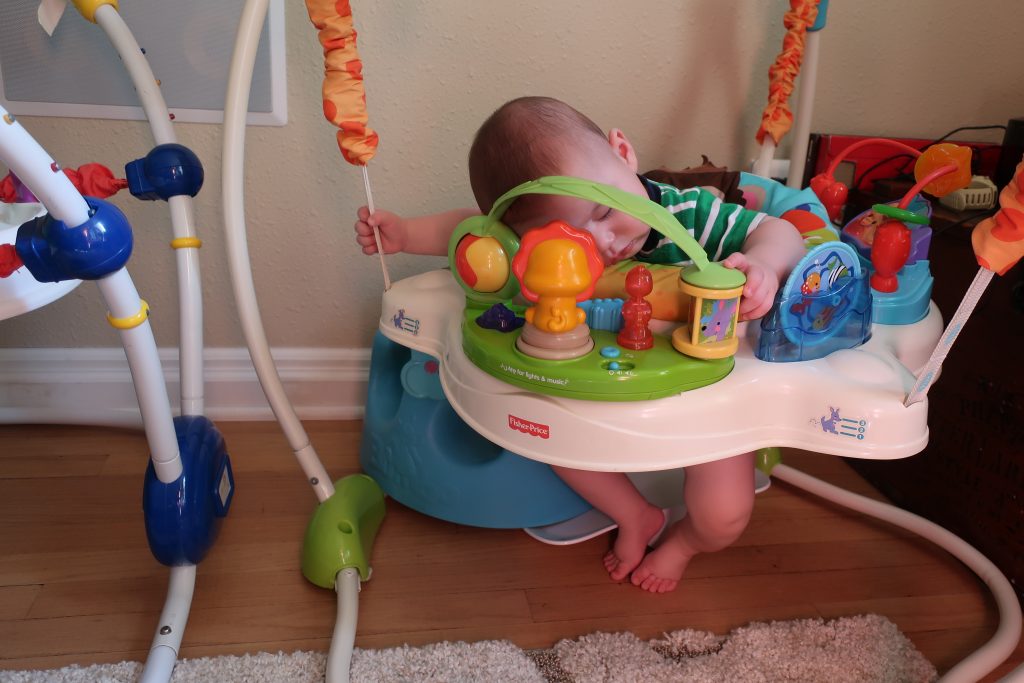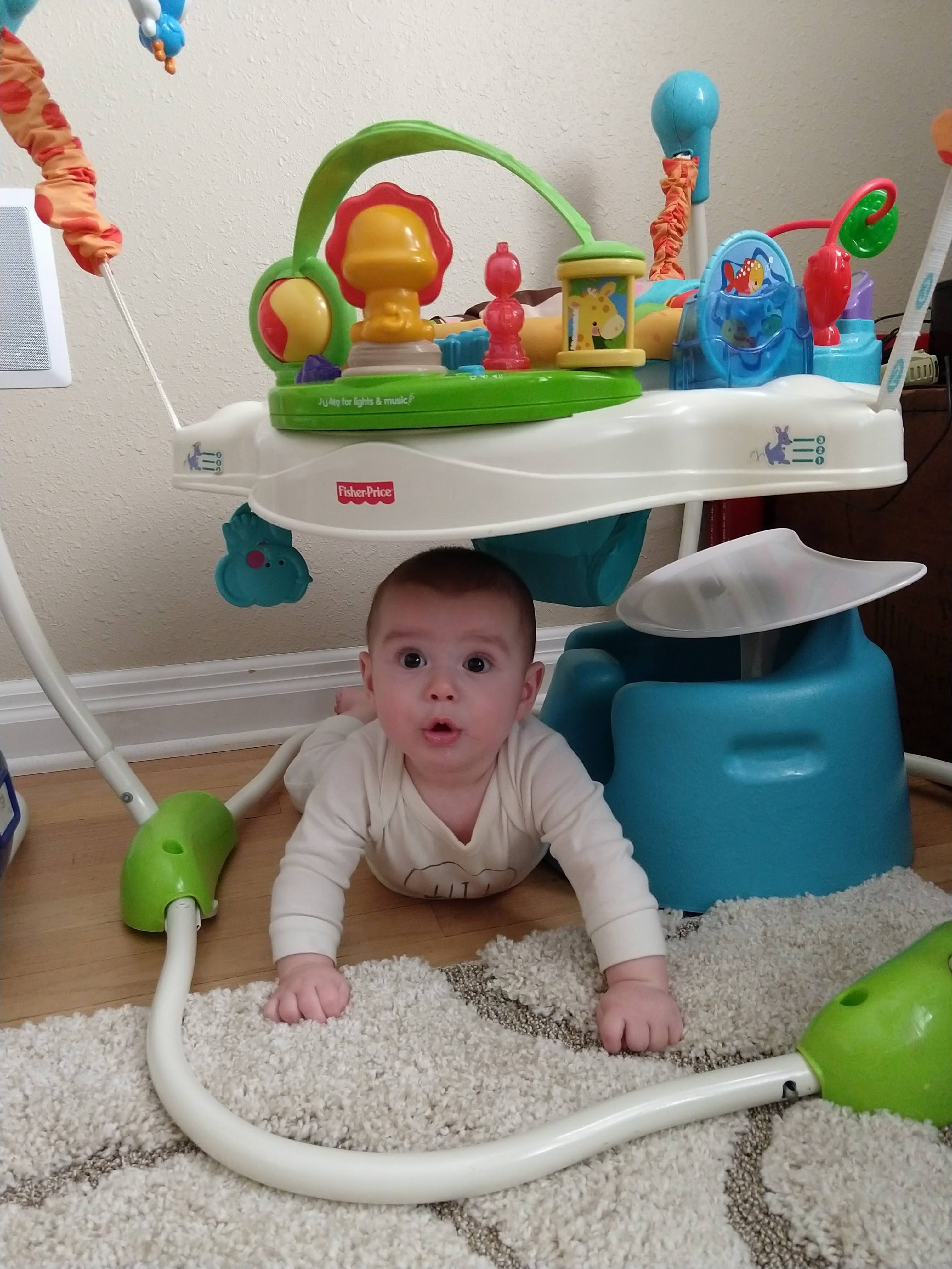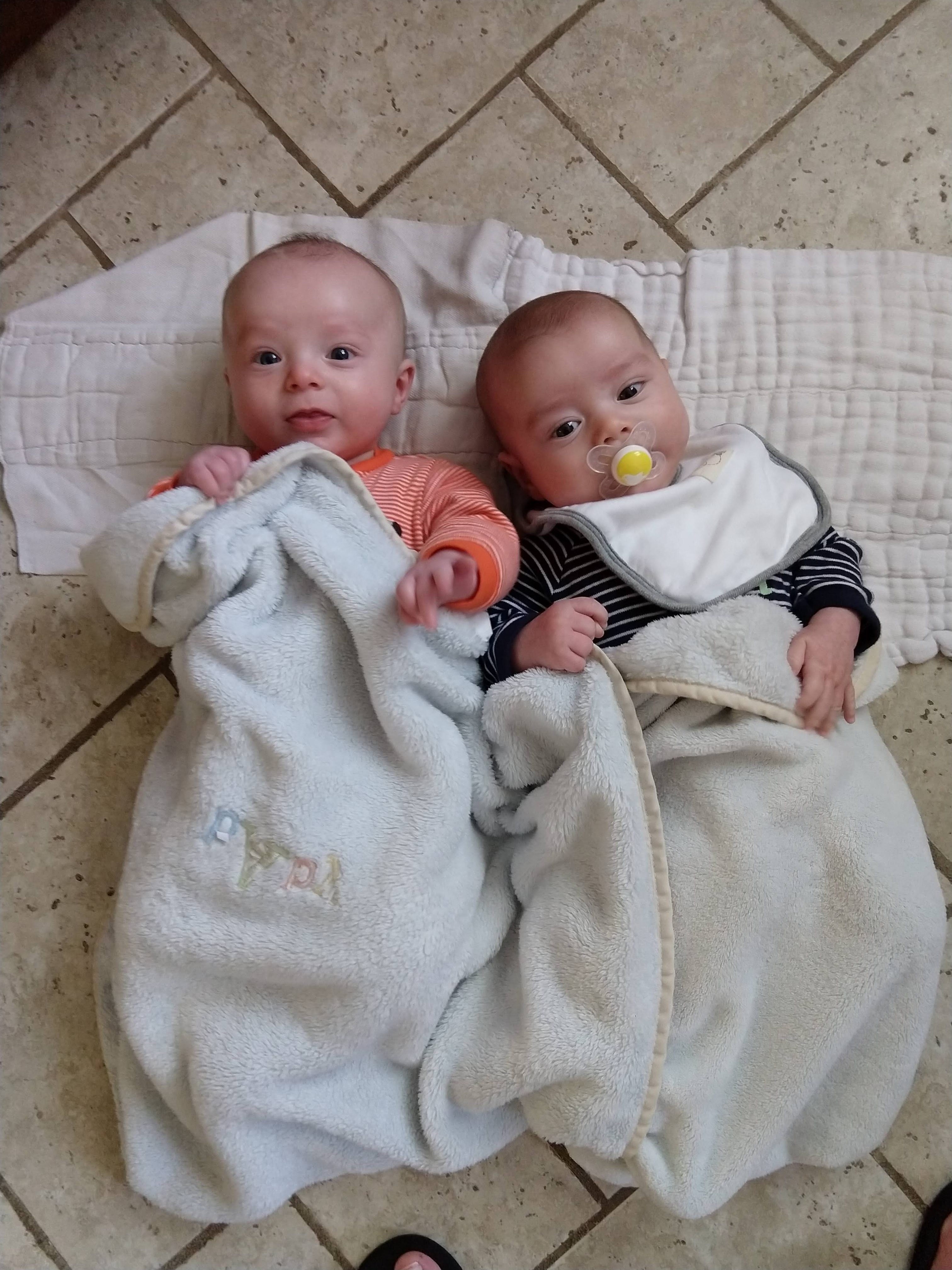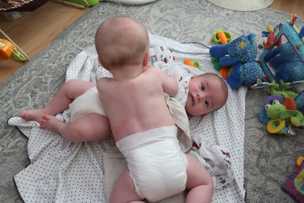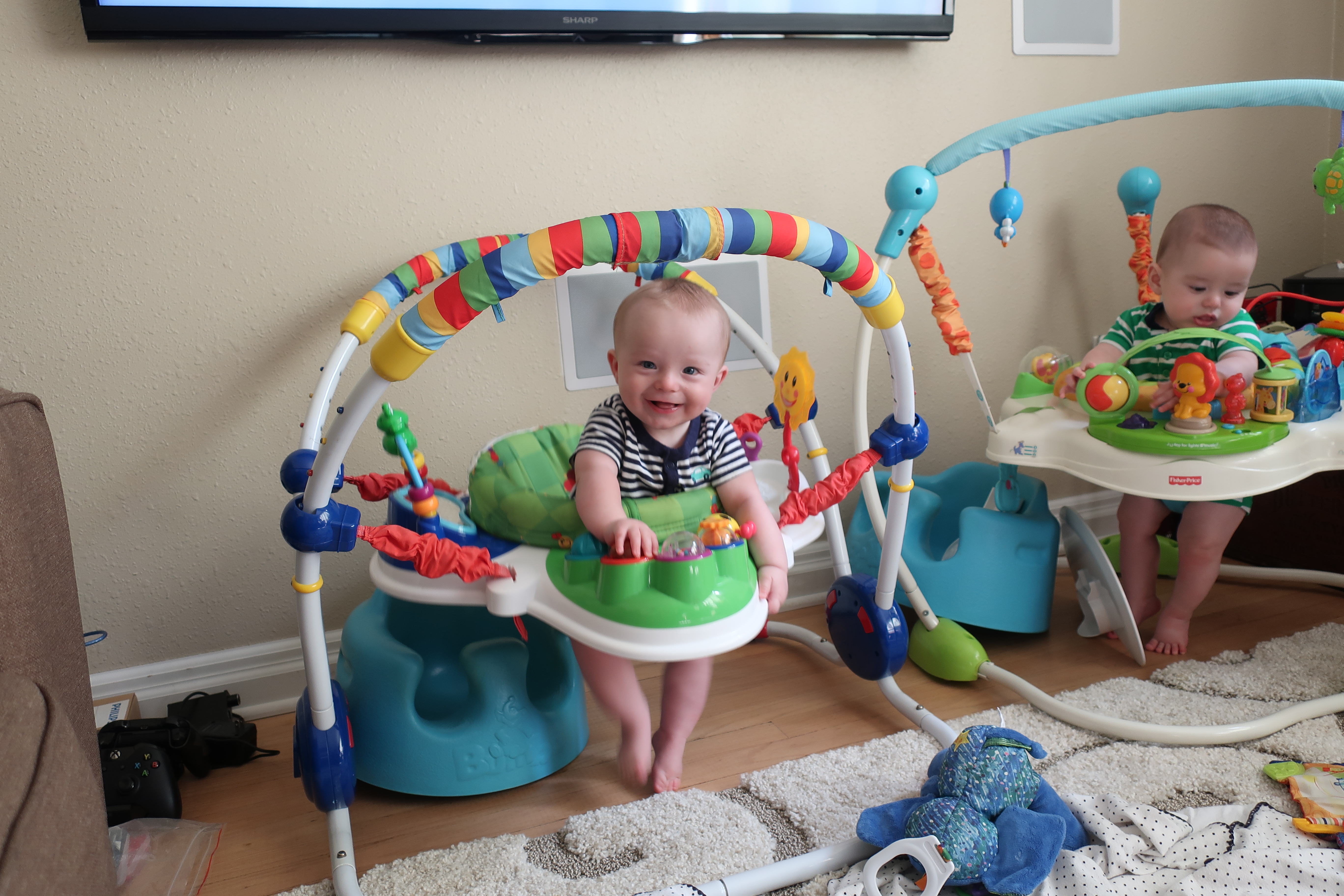 We can already see that these two have distinctly different personalities. Avit is pushing himself up to sitting (and has been for a couple weeks now); can move himself around a room through a combination of rocking/rolling/sitting/repeating (everything but crawling so far); loves to grab anything in sight and mess with it or try to eat it, including Nat’s head or arm or buns, my leg (yes, the other day i was standing on their blanket in the living room and Avit grabbed my leg, wrapped his arms around it, and started licking it!), and all their toys; and generally not nap when I’d like him to. And just 2 days ago he pulled himself up on the edge of the coffee table to standing! Good lord. Nat is much more content to just lie in his spot on the floor, play with his toys, roll over here and there but nothing crazy (no ending up on the opposite side of the room or in the corner facing the wall under the jumperoo like Avit), and take his naps like good little babies should. Sometimes they actually get on opposite nap schedules – Nat takes a decent morning nap; Avit does not. Then after lunch I put Avit down and Nat wakes up for the afternoon. Turds.