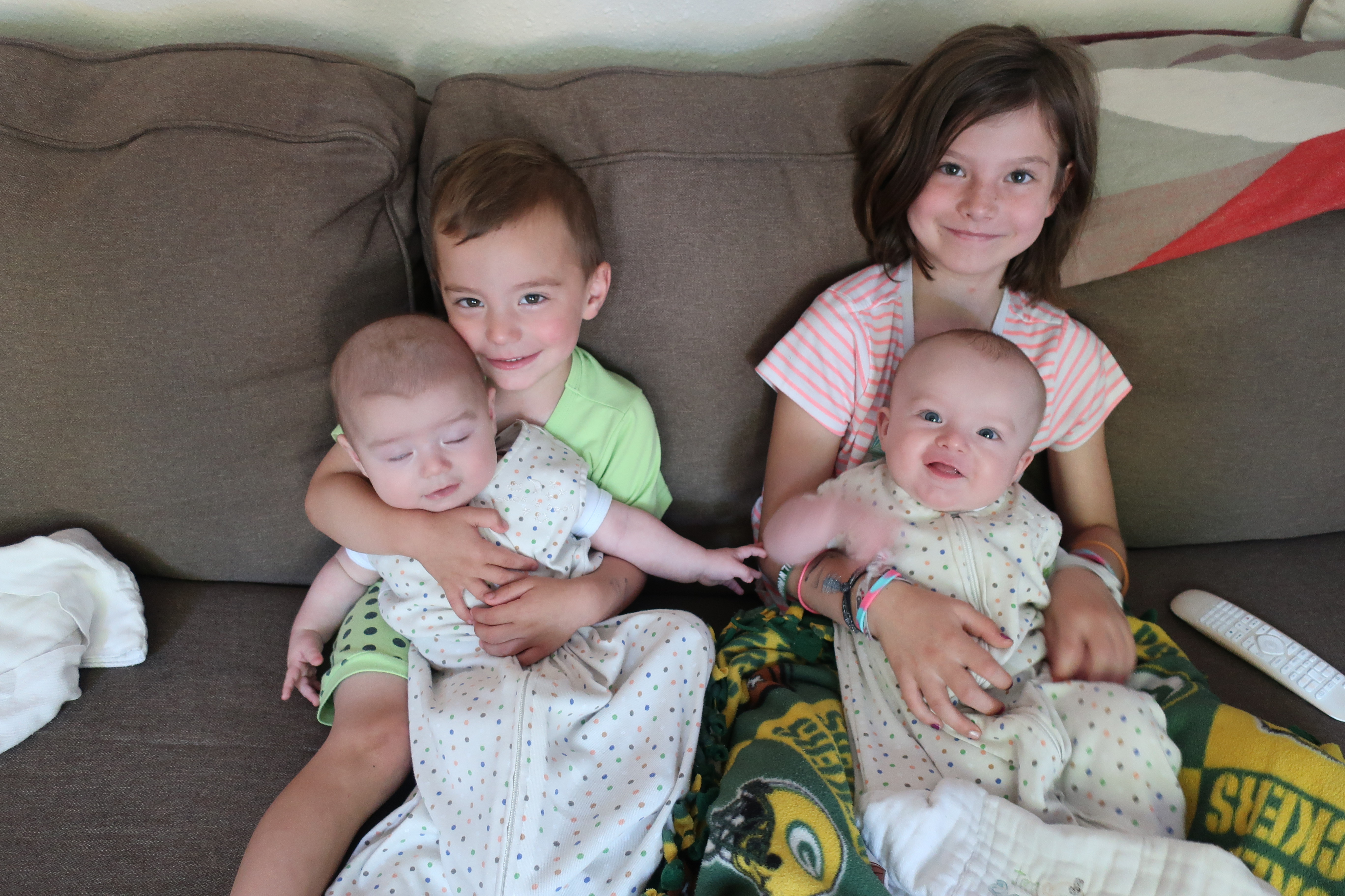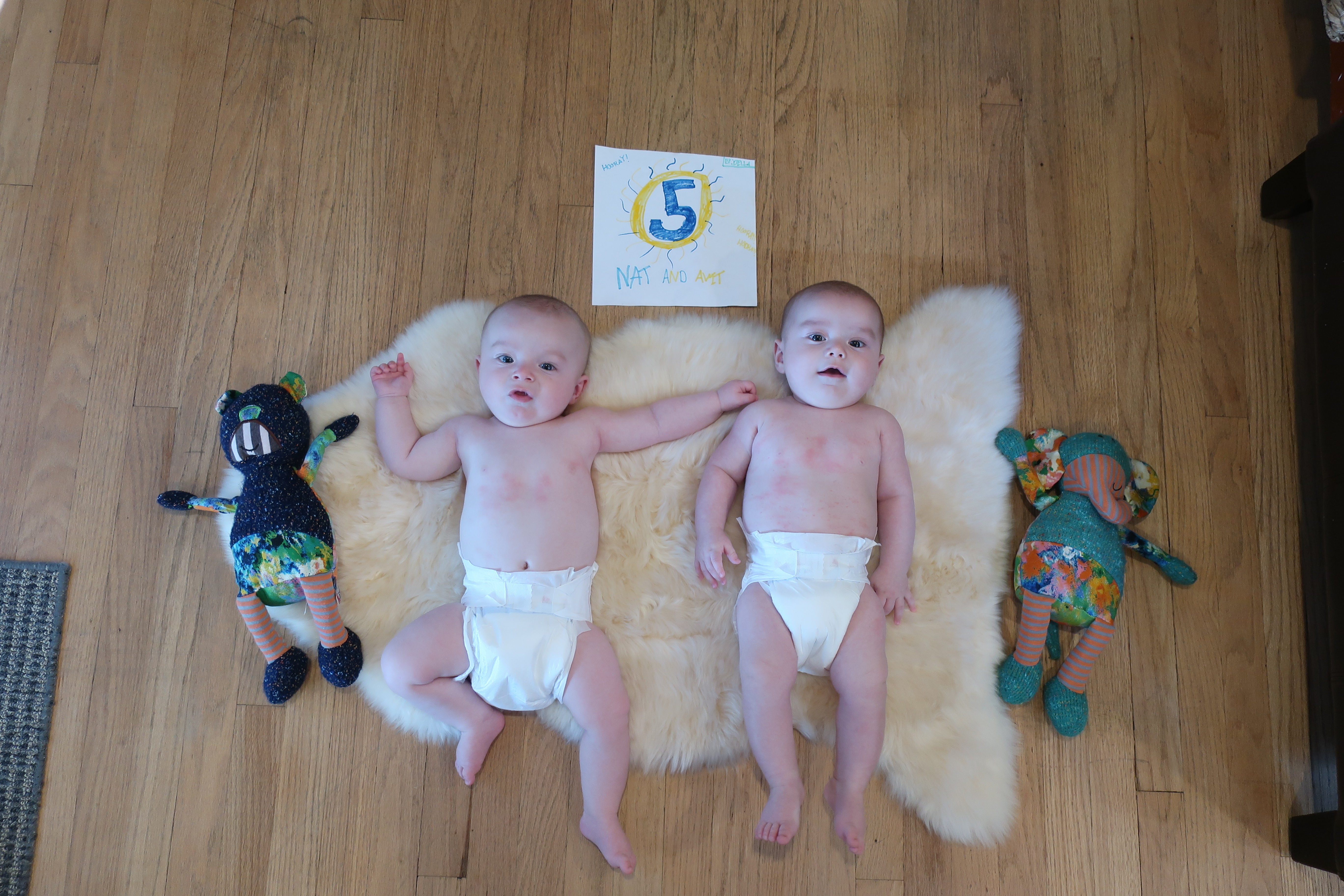 So, that was more than a quick update, but life is pretty great with these little guys. Like Della said in her note to me last summer when I was so upset when we found out we were having twins, it’s going to be fun! It is a shit ton of work, and every day has to be a very controlled level of chaos or else it can get overwhelming, but I think I’m doing a pretty good job. Plus the big 3 really are excellent helpers, which is a lifesaver. It still sounds so weird to me to hear myself say we have 5 children. I think it always will!