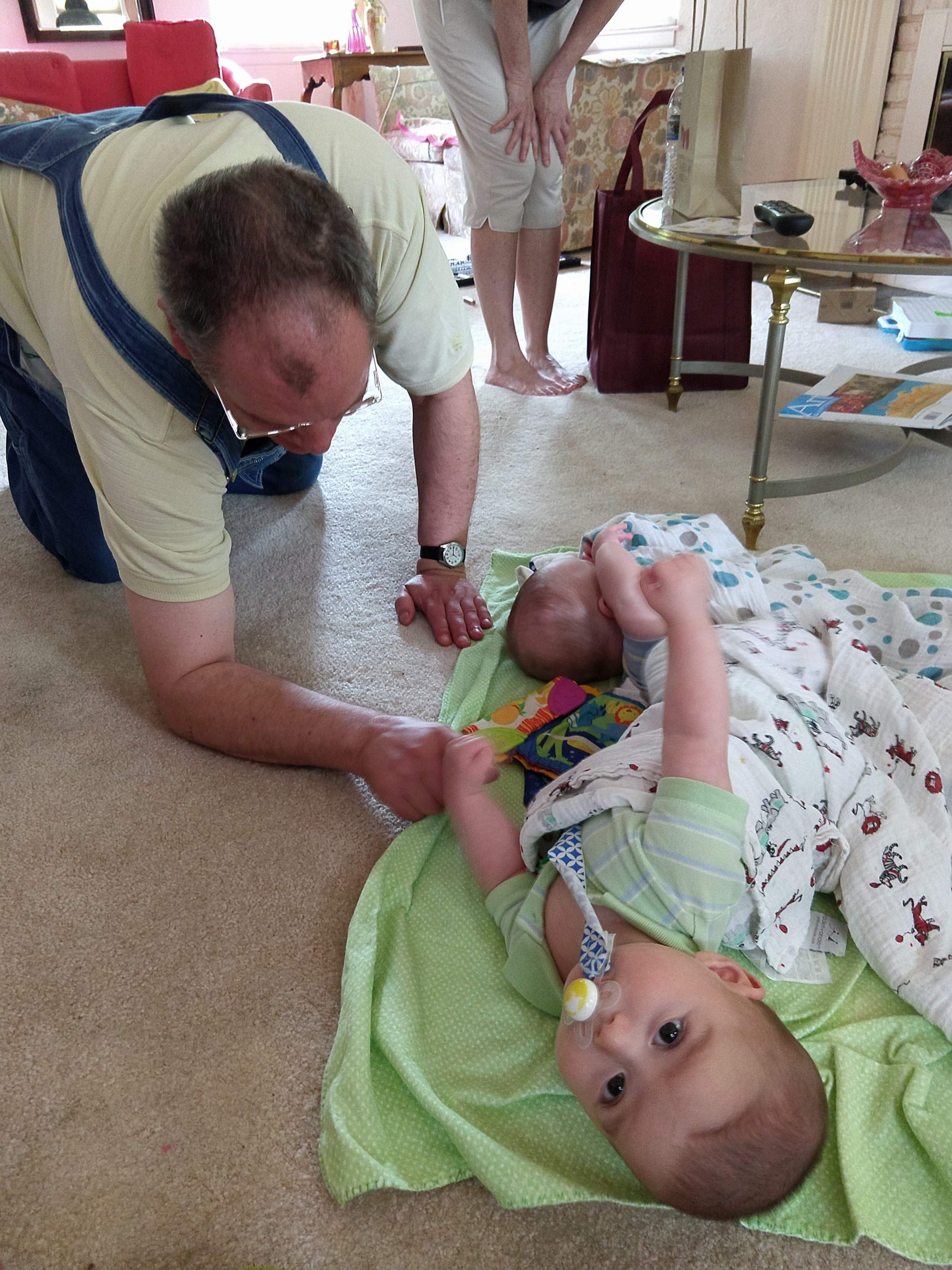They do make up for my lack of sleep during the days with their smiles and general happy attitudes. Lately Avit has started doing a ton of talking, with “da-da-da” and “ga-ga” sounds and even mimicking Ryan the other night when he was saying hi. Nat does more of a “singing,” with high-pitched little squeals and shrieks like Lana used to do, plus a ton of raspberries blowing and motorboat noises. It’s pretty hysterical. And they both get huge chuckling belly laughs going, which is just amazing. When I pick Nat up, he loves to grab the sides of my neck, pull in real close to my face, and act like he’s going to eat my nose. I love it!