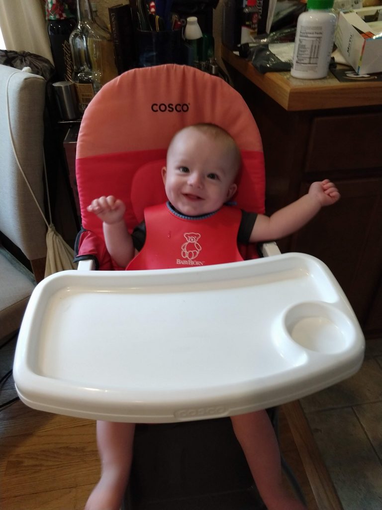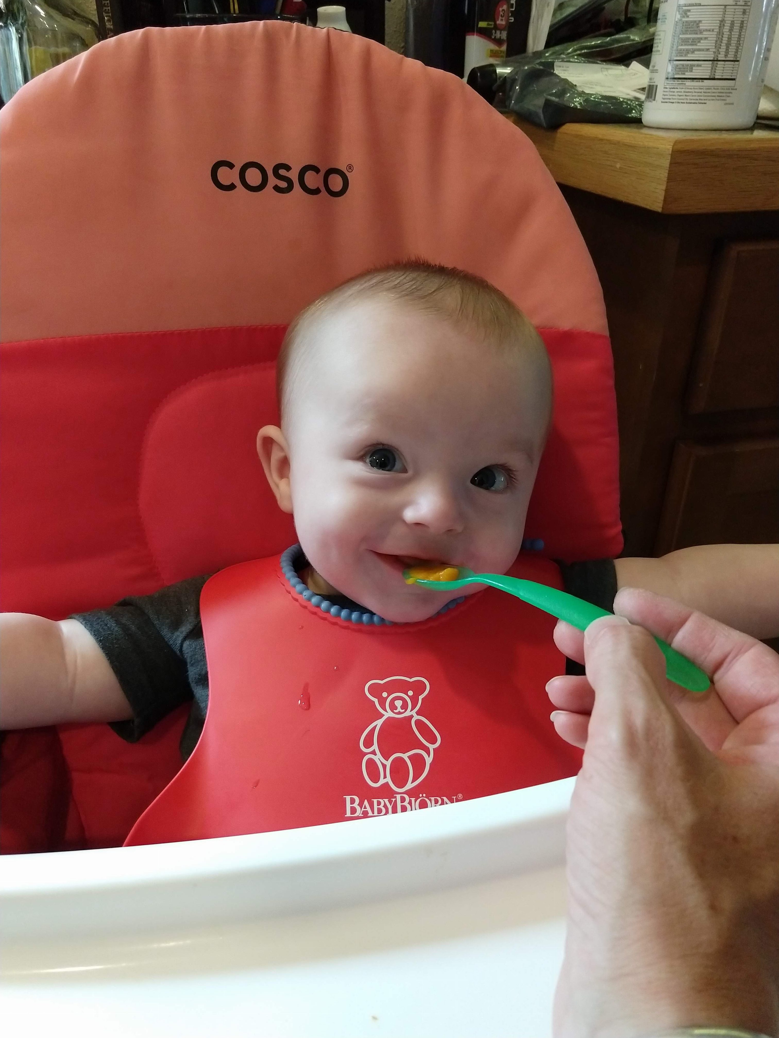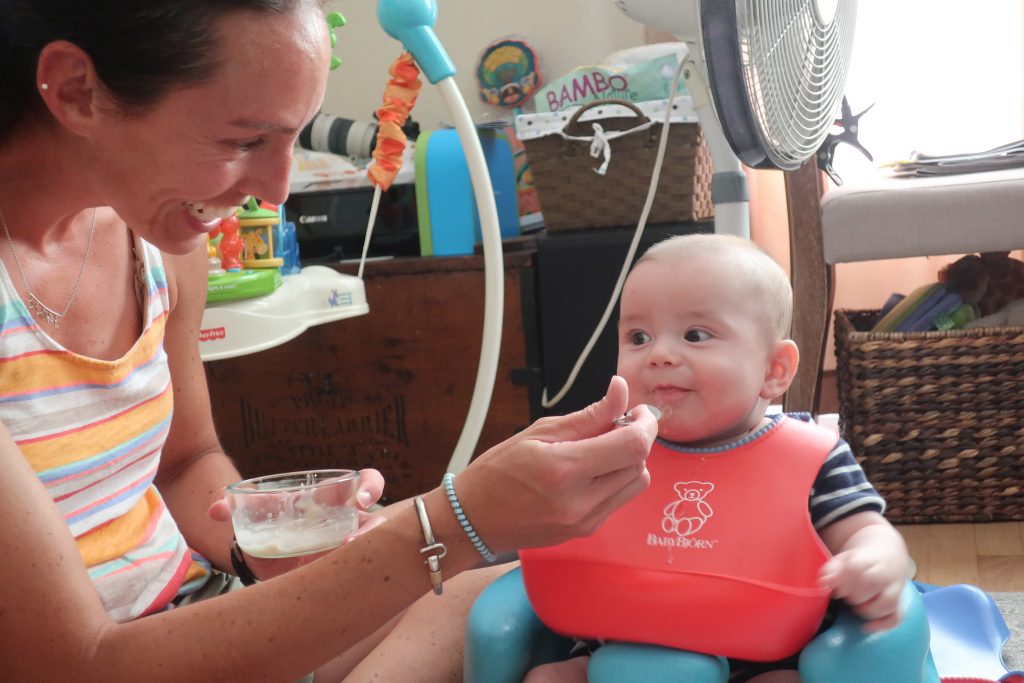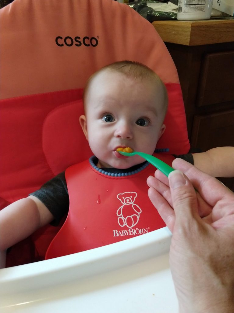 I just consistently started solids last week. I tried them a while ago, and neither one had much interest at all, surprisingly. Avit loved his first taste of oatmeal and wanted to grab the spoon and do it all himself. But then when I tried other things like sweet potatoes, he would barely take a bite. Nat got his start at solids later than Avit because I was giving them at dinner time to begin with, and Nat was always taking his 3rd nap then (yes, 3rd nap of the day). So he missed out for a while, but once I gave him his first bite of sweet potatoes, he loved them and actually did a lot better at eating than Avit. Now that we’re into the school routine again, I’ve begun trying to give them their solids at lunch time instead, since dinner time always gets so hectic. Some days it works out that way, some days it doesn’t, but they seem to be doing fine with them at either time of the day.