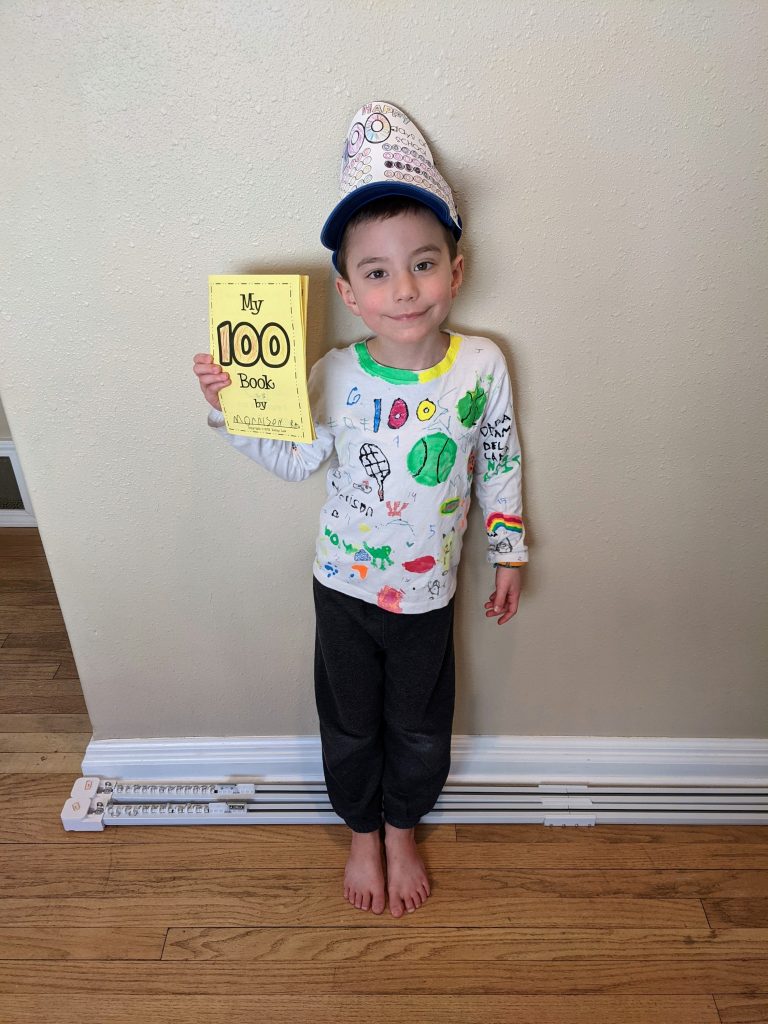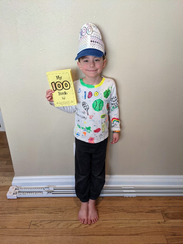 Today was your 100th day of K5, and you had so many fun activities! You wore your 100th day shirt from last year, you filled in your 100 book (100 things you wish you had, 100 things you wouldn’t eat, etc.), you got a new 100 math game, and you made your 100th day hat. I just love that you guys still get to do so much fun stuff while we’re doing school at home. Your beautiful little spirit shines through in every school meeting, always signing off with, “Bye, love everybody, good day, good school, Ms. Ruetz is the best teacher ever! Bye! Love everybody!” Never, ever lose that my adorable, sweet boy. I love you so much. Just like you love your school and friends.
