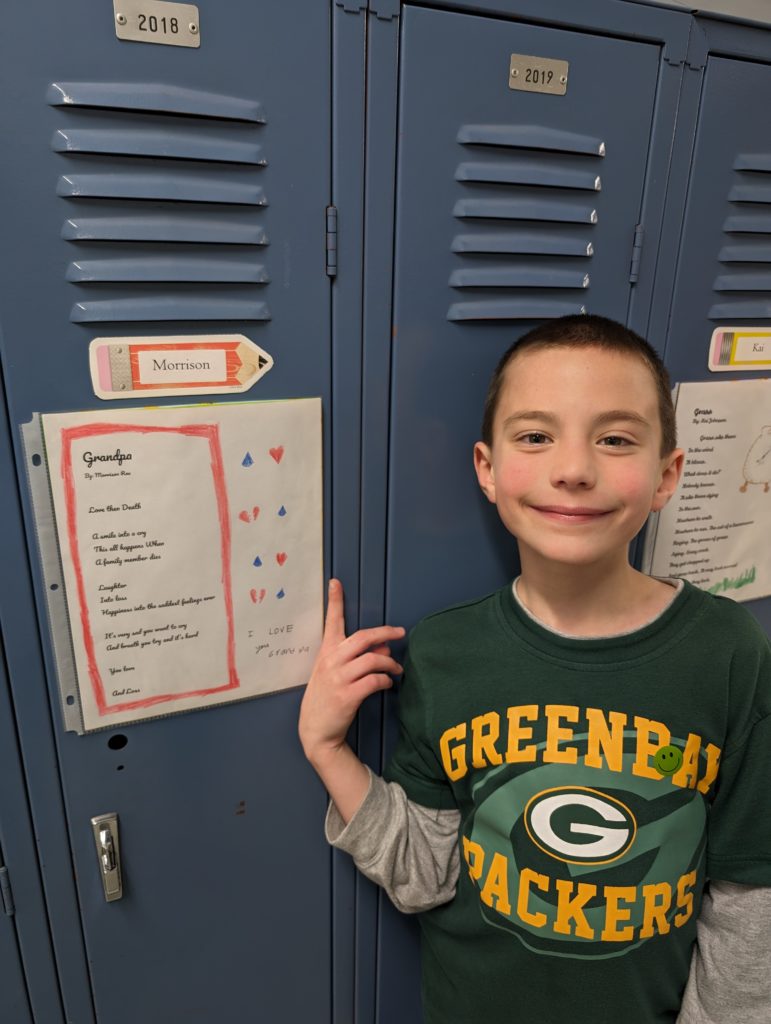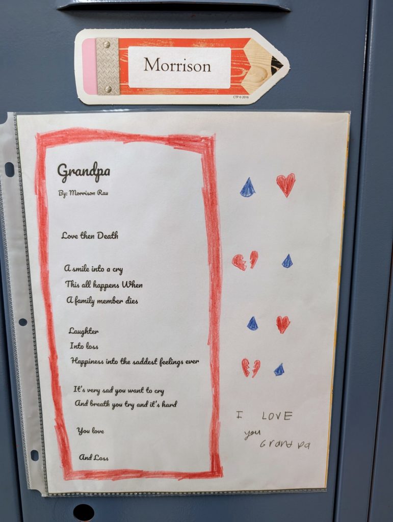 You entered a poetry contest through school a few weeks ago, and you’re going to be published! I forget the name of the company, but they compile poetry from students across the country and publish a 200-page book that we’ll be getting in November. A couple kids from your class were also selected, and you were so excited! I’m so proud of you, my love, that’s incredibly impressive and exciting!!
