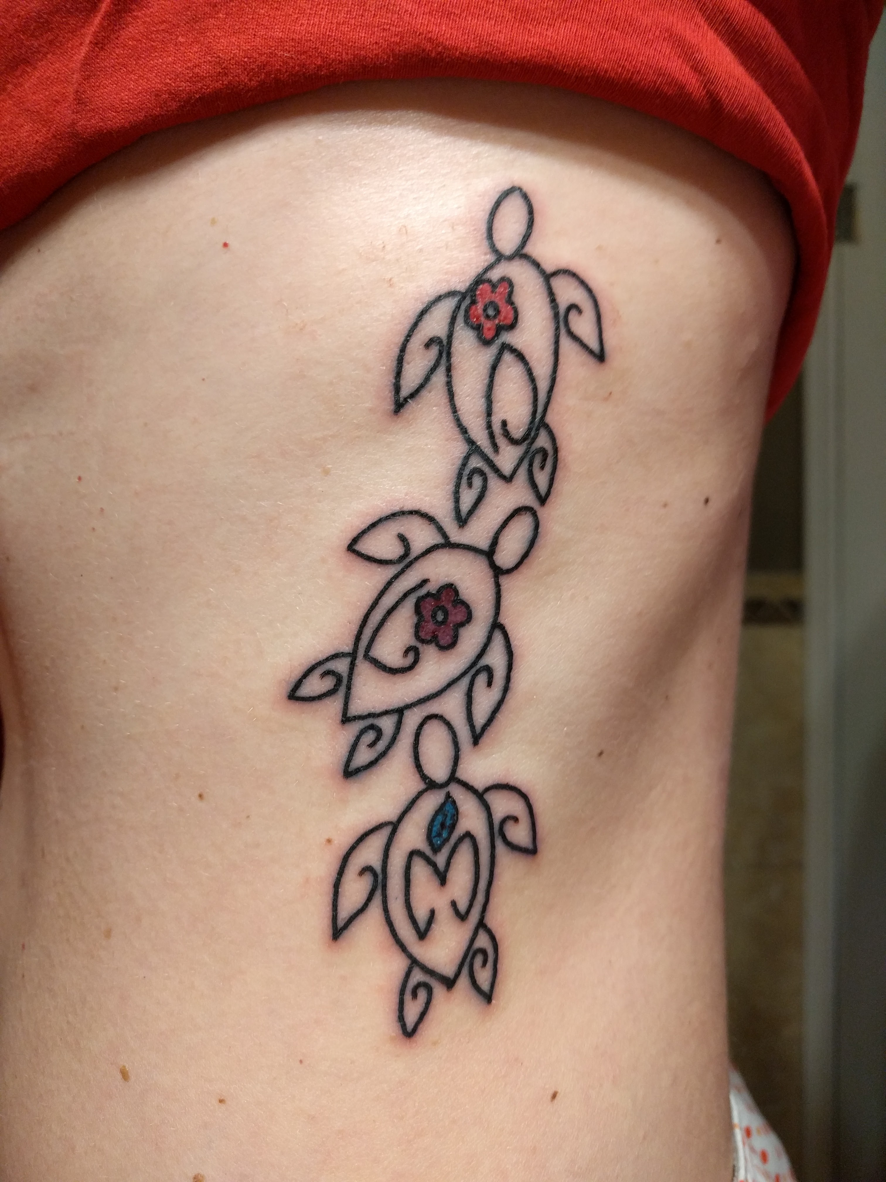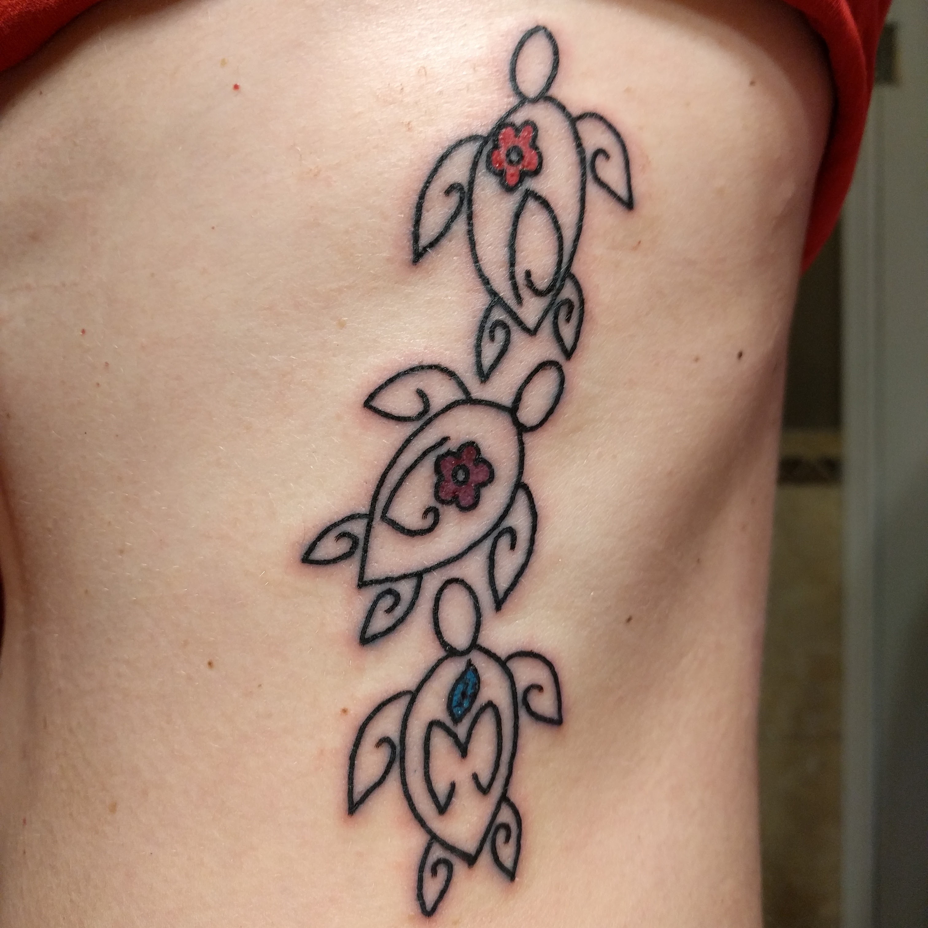 I don’t know why, but every time I thought of what represented the kids best, sea turtles came to mind. A while ago, I had envisioned tiny little sea turtles wrapping around the inside of my left wrist. But they would’ve had to be super duper tiny so as not to be massively obvious, then I wouldn’t be able to incorporate their initials very well, yadda yadda yadda.