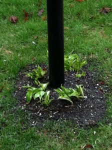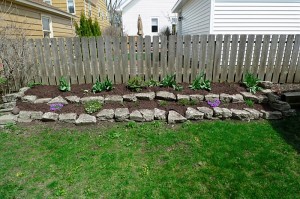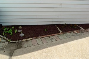 Ok, now at least a good hour later and D down for another nap, back out to my mulch. I got the floor mat scrubbed with soap and thoroughly rinsed, but you could totally still see where the brown puddles had been. Great. Too bad, that was just going to have to wait until Sunday to be rewashed. I had more pressing issues, like actually getting all this mulch into the gardens before the threatening rain clouds that had now blanketed the area unleashed their fury on me. 2 hours, 4 gardens, 12 empty mulch bags, and one very tired back later, I was done! And I think they turned out pretty well, ifidosaysomyself.