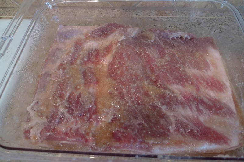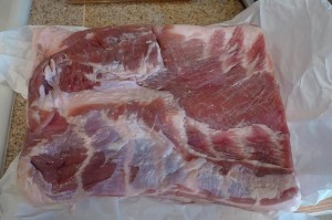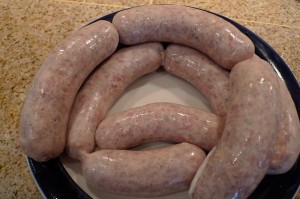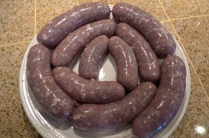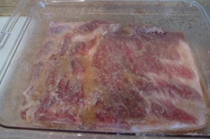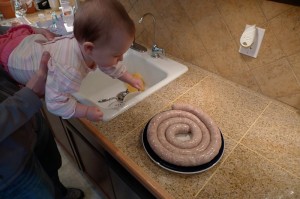 Once I had all the mulch unloaded and the mat from the cargo area laid out to be scrubbed and dried in the sun that was still shining at that point, I went inside to see how D had been for Daddy. Guess what awaited me in there? Another mess, yippee! R has begun his latest hobby of charcuterie, and this was his weekend to try his hand at homemade sausages and bacon. I have sung his praises over and over for being such a great cook, but bless his heart, he is not the best cleaner-upper. Especially when it comes to raw meat, I don’t take any chances. I like knowing that everything has been thoroughly cleaned and sanitized so as not to leave any salmonella or e. coli running around the kitchen, where D loves to scoot around and put everything she can find into her mouth. So I fed D some lunch (not fun since she was being a pill and was cranky all weekend, which added to my mess-induced anxiety) while (not-so-)patiently waiting for him to stuff the last casing and take everything down to the big freezer, then proceeded to scrub down the counters, sink, faucet, and floor to remove every last bit of raw sausage and grease that I could find.