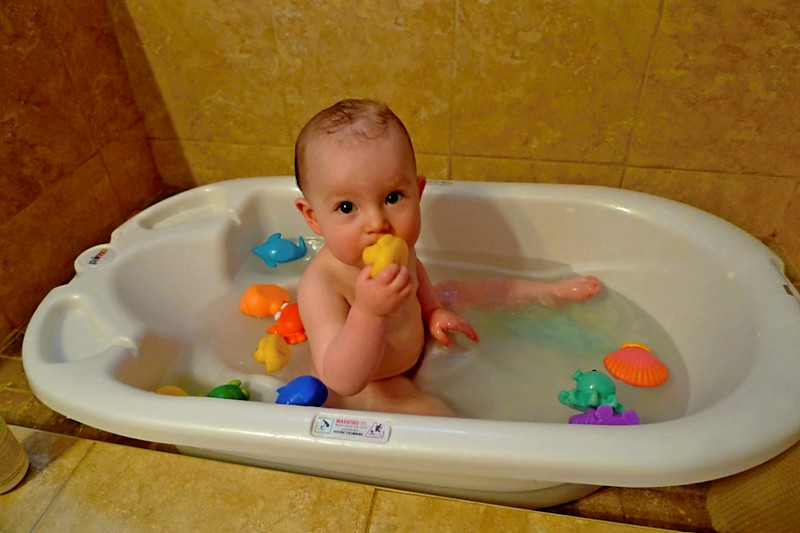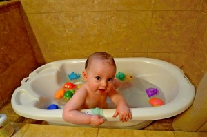 So Saturday verged on a waking nightmare for me. It all started out innocently enough – D woke up around 7 so I got up and took care of her while R slept in. After a little breakfast I gave her a bath, and it was the first time I cracked out a bag of bath toys. Oh my lord was she in heaven! I’d gotten them out a few days prior for her to play with while sitting in her bathtub dry as I got ready in the bathroom, but she hadn’t had them in the water yet. It was a whole assortment of sea creature squirties, and she had a ball.