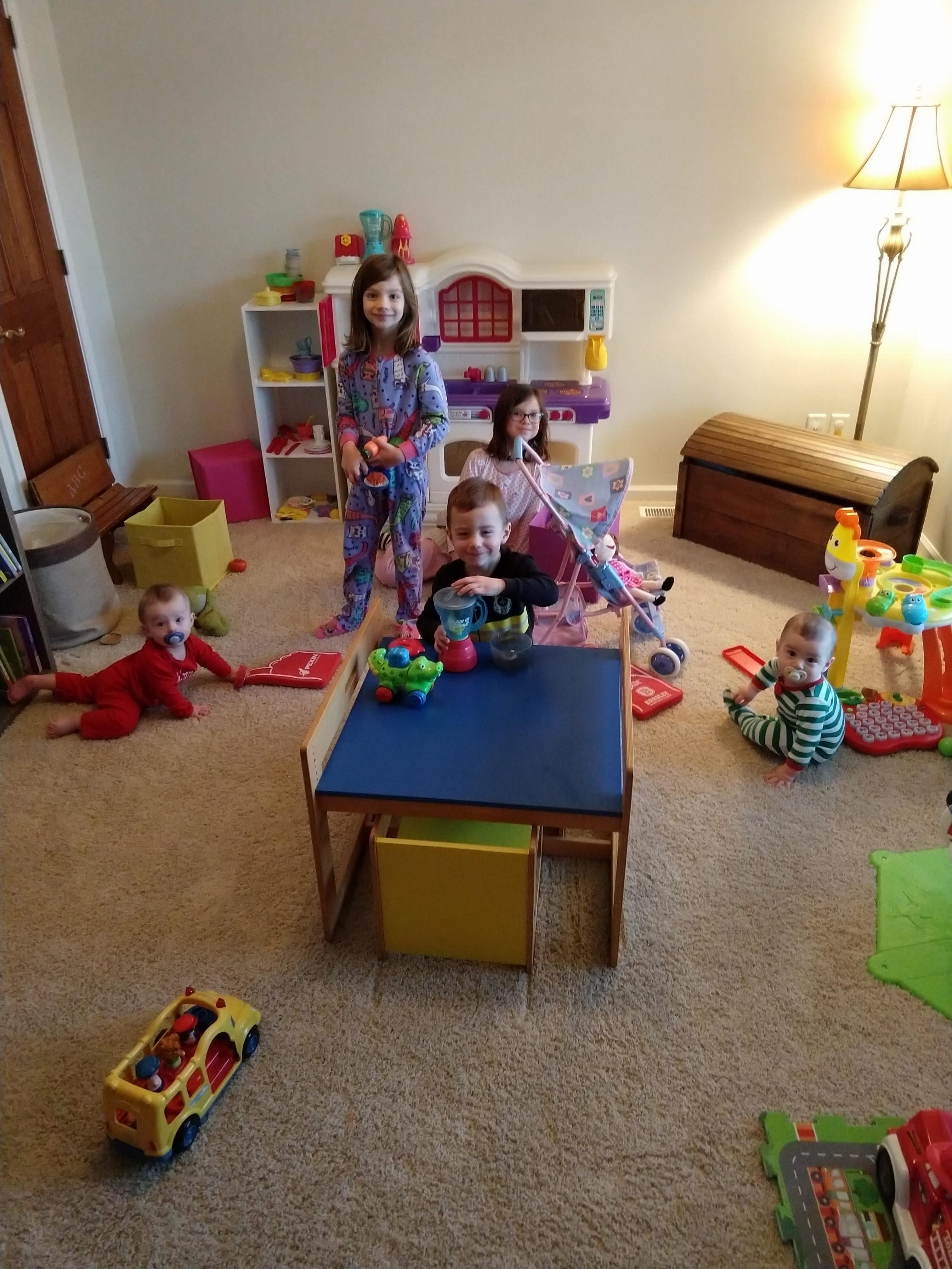 We went home mid-day on Friday, after both the twins and I cleared all our checks for discharge. My mom stayed with us through that weekend, then Ryan had 2 weeks off work, which was amazing. We all got to take naps every day, and I was able to sleep in until just before the girls got off to school, so that extra sleep that I didn’t have in the early days with the other kids was a lifesaver. Then my mom came back up for a week after Ryan went back to work, yet another lifesaver. Friends and neighbors have also been massive helps, bringing meals and giving the girls rides to and from school. Simply not having to leave the house with all these children has been a tremendous sanity saver for me. The twins still have no morning schedule to speak of and nights continue to be iffy, so if I had to try to get all 6 of us ready to get out the door by 7:45 each school morning, I’d probably be out of my mind by now.