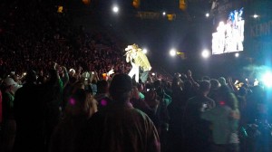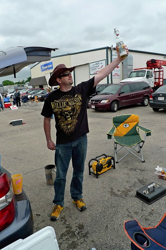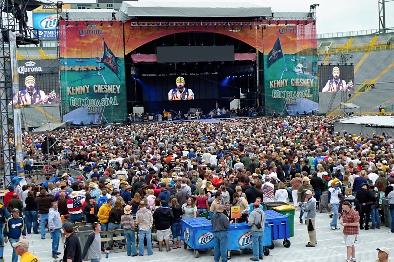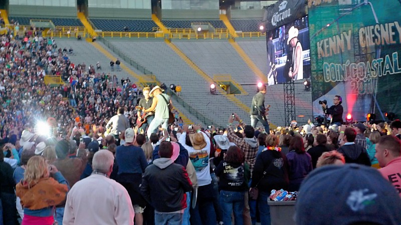 We had a blast. It was just the 2 of us partying together the whole time, seeing how much hell we could raise. Just like the old days. 😉 Coincidentally enough, we parked in the same lot we’ve parked in the last 2 times we were at Lambeau for Packers games or celebrations, so we knew it was an easy walk to the stadium. Plus we were right next to a port-a-john, a HUGE bonus, and we were in the very front row and able to drive right out afterward instead of getting mired in the concert traffic. Our tickets were down on the field, and we got into the show toward the end of Billy Currington’s act. We made our way up to almost the very front, saw all of Zac Brown, all of Kenny, and then obviously the group jam at the end of the night. Mike McCarthy made a special appearance at one point and brought the Lombardi Trophy out on stage, and of course the place erupted in cheers. Another Packer also joined Kenny to sing a few lines, but neither of us could really tell who he was; plus he definitely did not have a singing voice.
