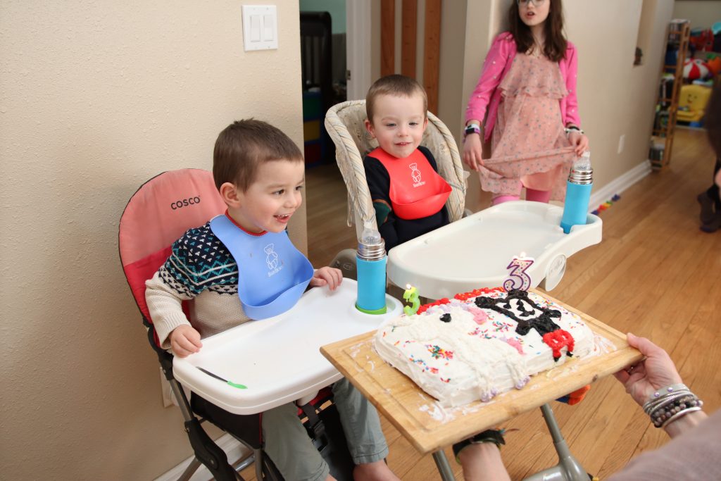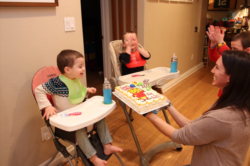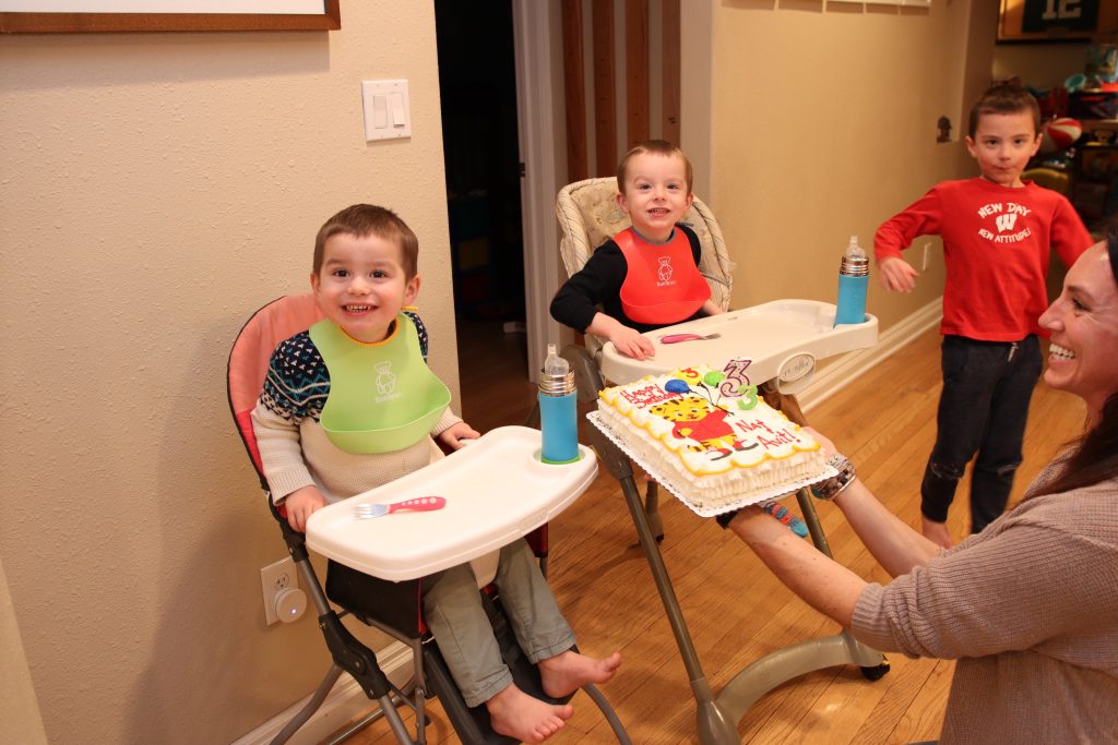 They had a really fun day to celebrate the big 0-3. Grandpa Frank came into town for the weekend since his birthday is the day before theirs, we got a huge snowstorm on their birthday, our great friend Miss Clara came over to sing happy birthday at lunch time, and they got 2 cakes! Della made them a fantastic Uni and Mickey funfetti cake by request, and I ordered an awesome Daniel Tiger cake from my favorite bakery in Peoria that Grandpa brought up.