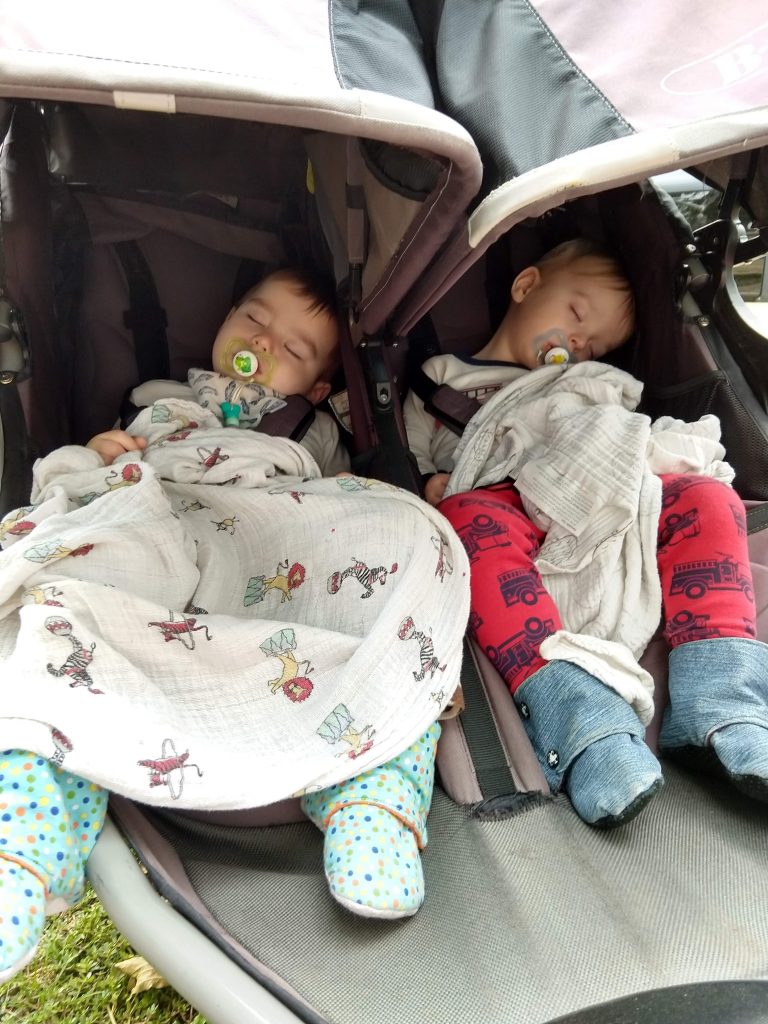 They do still go to bed by about 6:00 in the evening, and the middle-of-the-night wakeups for a pacifier or just to cry out or whatever have dwindled significantly. Avit does talk in his sleep, though, which is hilarious. However, their new morning wakeup time is 4:45, which does not jive with me. On school days my alarm goes off at 5:30, so when they wake up too early I put on Daniel Tiger and they happily sit in their cribs learning life lessons while I sleep. I thought this early wakeup time was due to the summer light, since that’s when it started, but now I don’t know why it’s sticking around. Changing their bedtime doesn’t make them wake up any later, either. Sometimes they’ll sleep until 5-5:30, but I can’t get them to stretch it past that yet. No wonder they’re exhausted by the end of the morning – they wake up too damn early! Coffee, coffee, coffee.