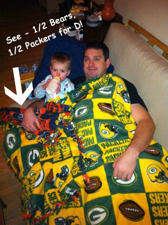 Now, as a Bears fan myself, it pains me to think that my sweet, sweet baby girl may one day grow into a full-blown Packers fan, sporting only the green and gold that runs so rampant ’round these parts. For up until now, she’s had a shared loyalty – Bears for Mommy and Packers for Daddy. Complete with a couple cute Bears onesies and a set of Bears pjs to go with the mini-Rodgers jersey and Packers onesie that Daddy had to buy.