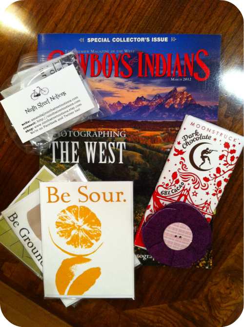 Isn’t that great?! We were told to send 5 items – an accessory, a paper/office/craft product, a food item, something that represents the area in which you live, and a beauty item. She lives in Oregon, so she sent along the beautiful Cowboys & Indians magazine. And that chocolate bar? Delicious!