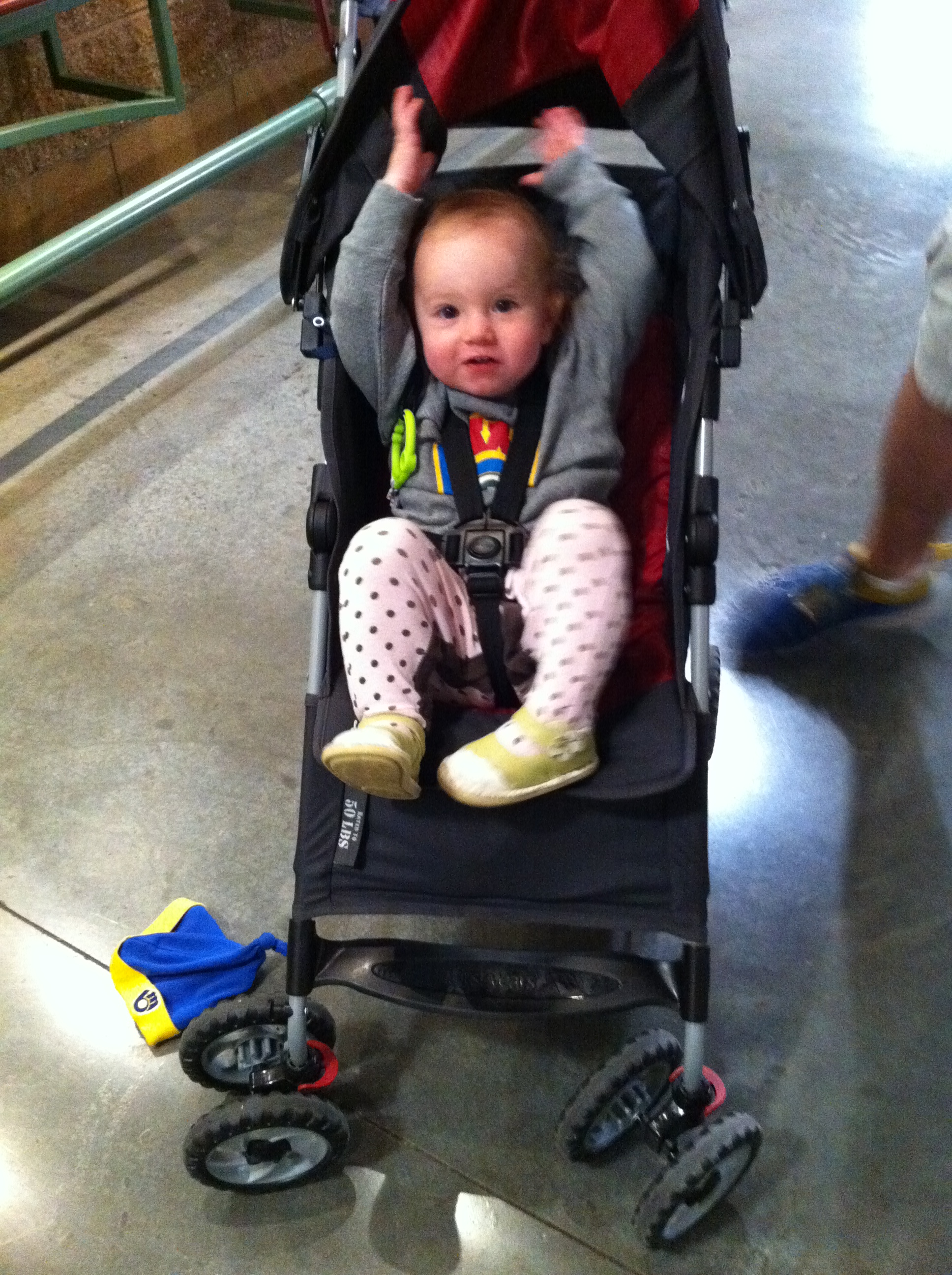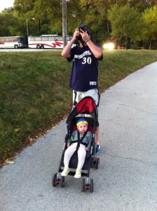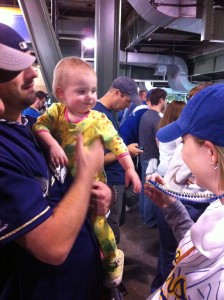 This vantage point was great and all, provided a nice view of the field and had plenty of room for us and the stroller, but since this was our 2nd game in as many nights we were ready to actually sit in our seats and give the legs a rest. So up to the nosebleed section we climbed. Fortunately Guest Services was outstanding and let us “check” our stroller into their room so we didn’t have to mess with trying to cram it into the jam-packed row of seats in our section. Bonus points, Brewers.
