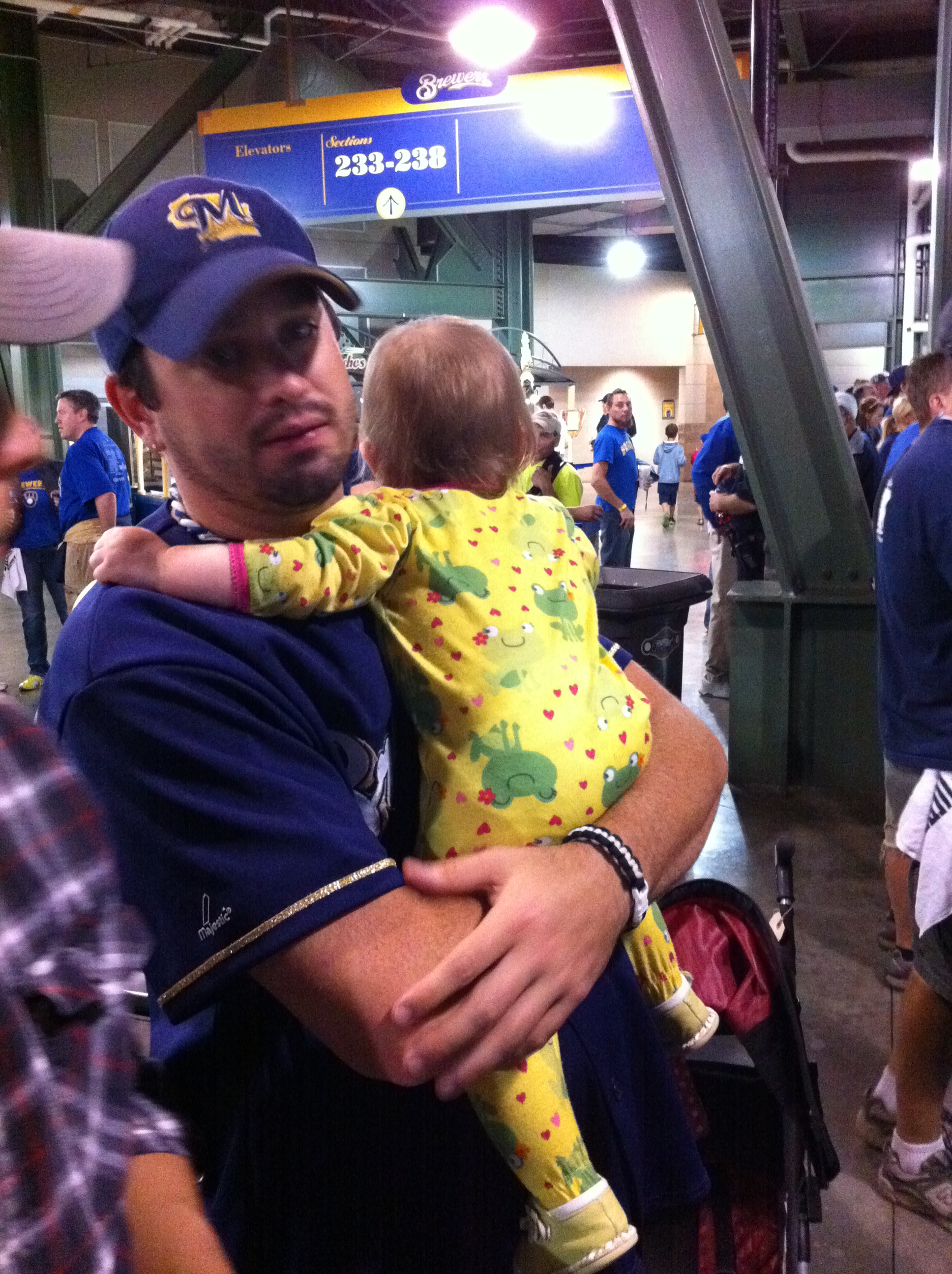 After an inning or 2 the close quarters and vertigo-inducing grade of the rows made us a little antsy, so we decided to give up resting our feet and headed back down a few levels. We had to make a pit-stop on the way to change D into her 2nd pair of jammies, since she peed through her original outfit while sitting on R’s lap up there. Oops. Our good friends A & S were also at the game, so we hung out behind their section for a bit to chat and commiserate over how poorly our team was doing. Ugh. Della loved S’s Brewers beads, though.