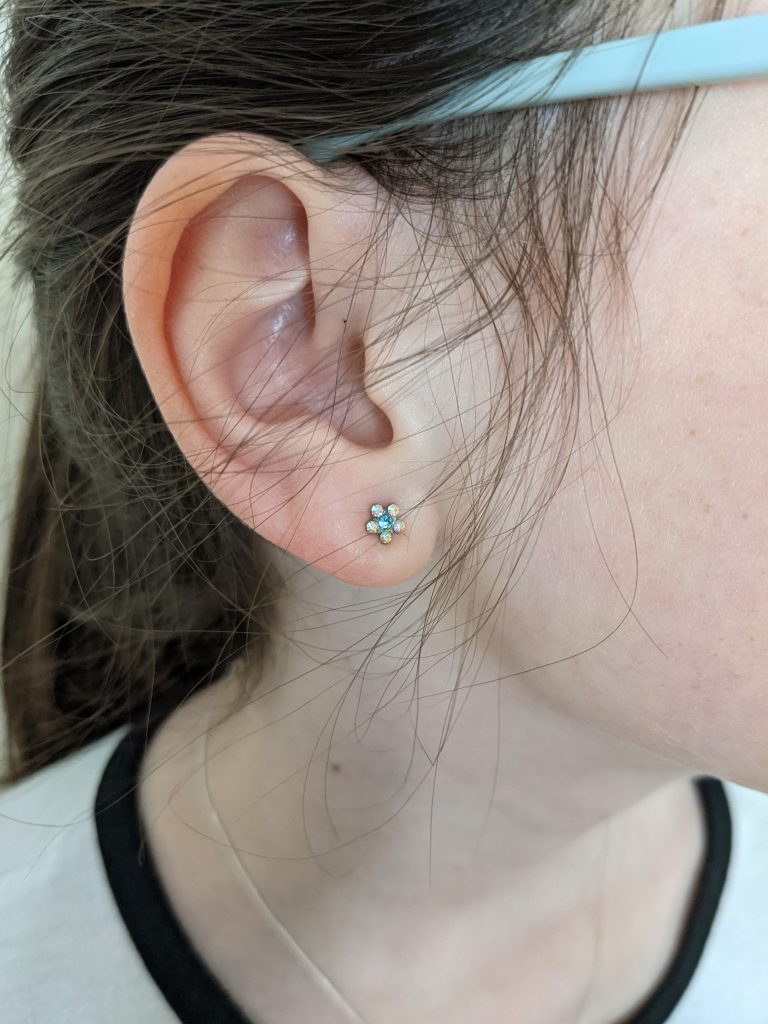 Big day for you today, peanut – you got your ears pierced! It had been a 10th birthday present, but you hadn’t really been persistent about it so it just kept getting pushed off. I finally called a couple months ago to make an appointment for you, and today was the first Saturday they had an opening. Daddy took you, and you were both excited and nervous. We all told you it would hurt a little bit but then go away quickly, so you took your round, white squishy to hold during it. But fortunately you said it didn’t hurt it all! The place you went does piercings only, and instead of the gun that I was used to they used a clamp and surgical needles. Awesome! You picked out the most beautiful little blue flower earrings, and they look amazing. Great job, my love!!