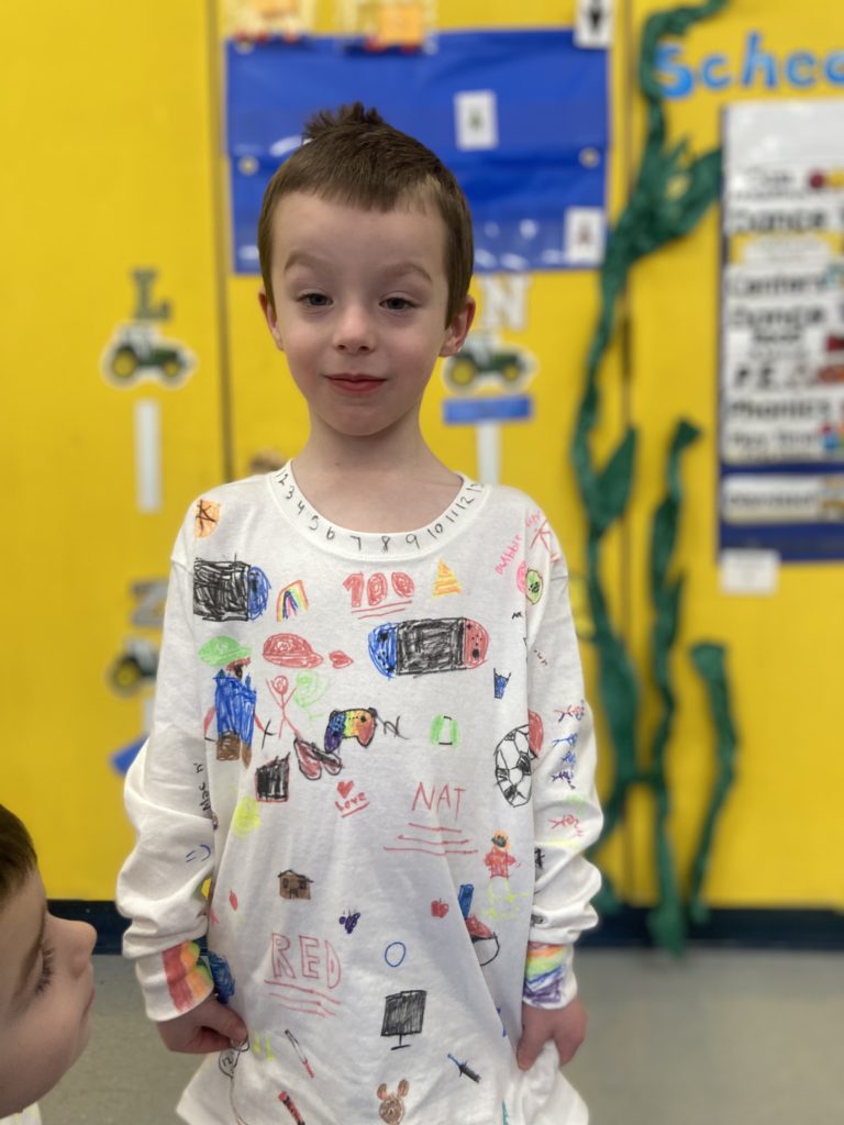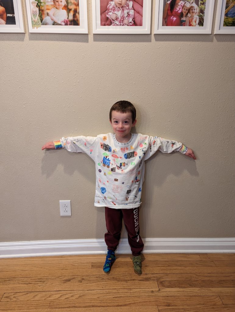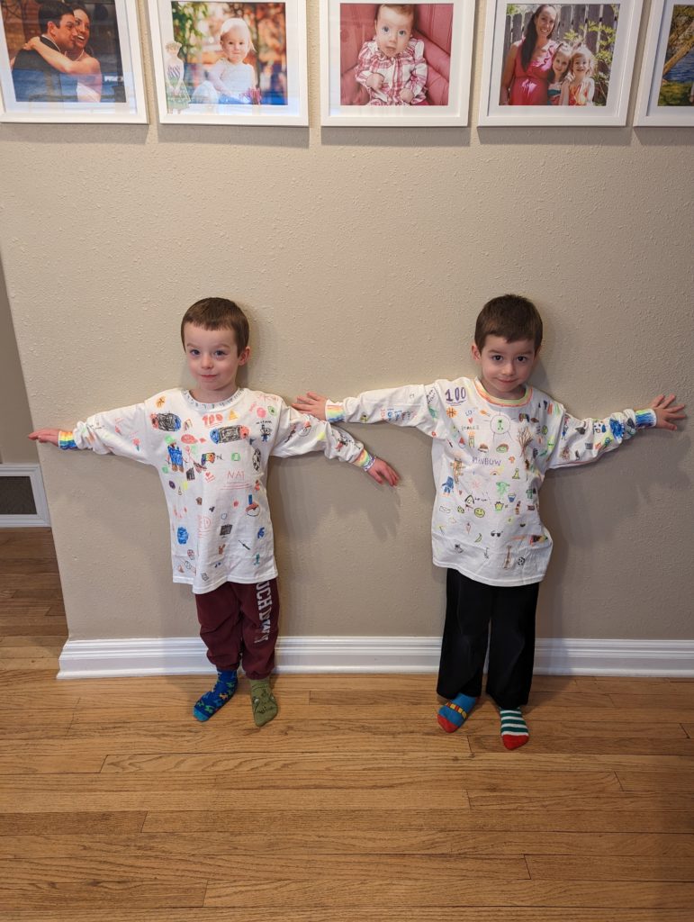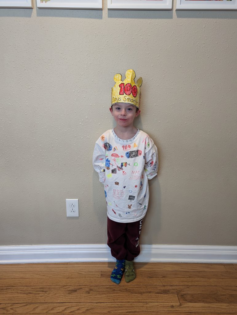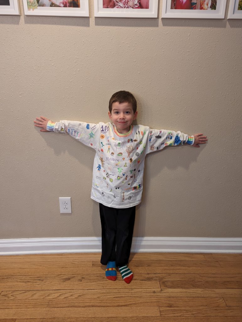 It’s your 100th day of school! You guys are so excited, because you get to finally wear your 100th day shirts that the big kids helped you make last weekend. They’re way too big, but who cares. I remember Morrison’s was, too, when he made it. Lana made one for K4, too, but hers actually fit. They turned out so great!