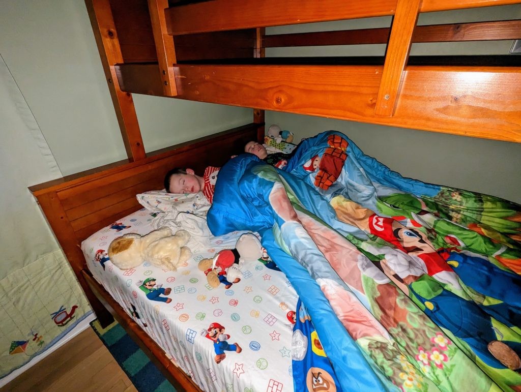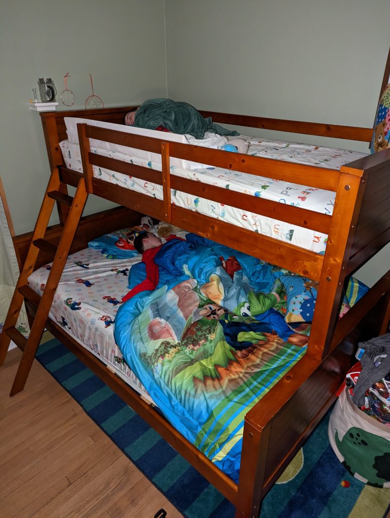 I finally bit the bullet and got the top bunk set up. Avit, you said you wanted to sleep up there, so up you go! Nat, I think you really wanted to stay in the bottom bed because it has the Mario sheets on it, but no arguing works for me!