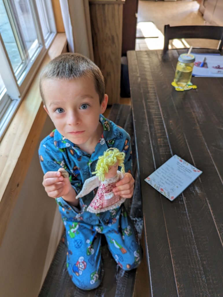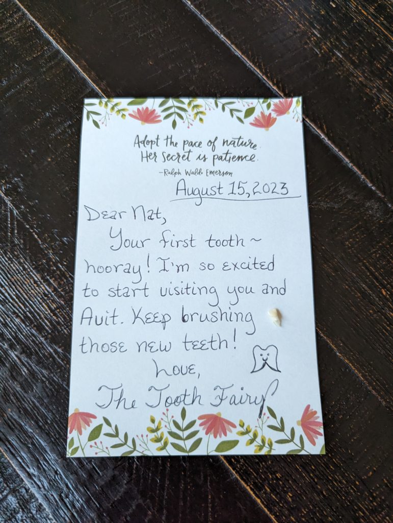 Natty Beans, that wiggly little tooth finally came out last night! You’d been messing with it with your tongue all week, so last night when you were getting ready for bed I said that little thing is about to pop out. So Daddy got a paper towel, and out it came! Now Avit, you’re on a mission to get yours out, too. 😉 The Tooth Fairy gets to come for you guys now, too!