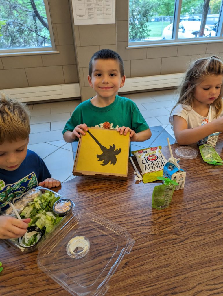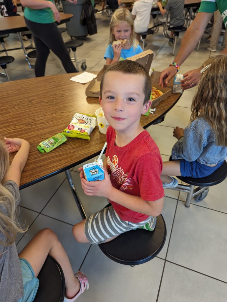 You guys are thrilled – it’s your very first Fun Lunch ever, since this is the first year you eat lunch at school, and I get to come help for it in the Great Room! Nat, you ordered mac and cheese, and Avit, you ordered pizza. I love it!