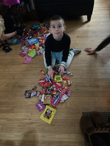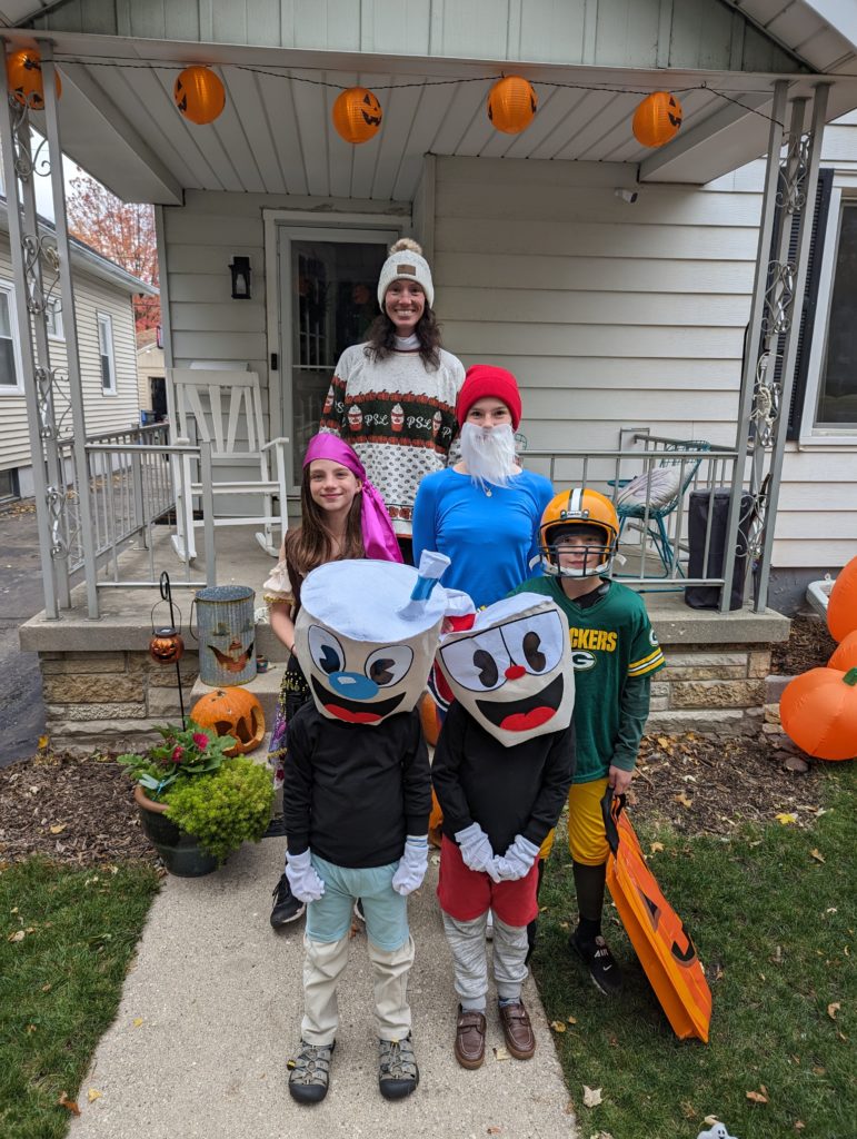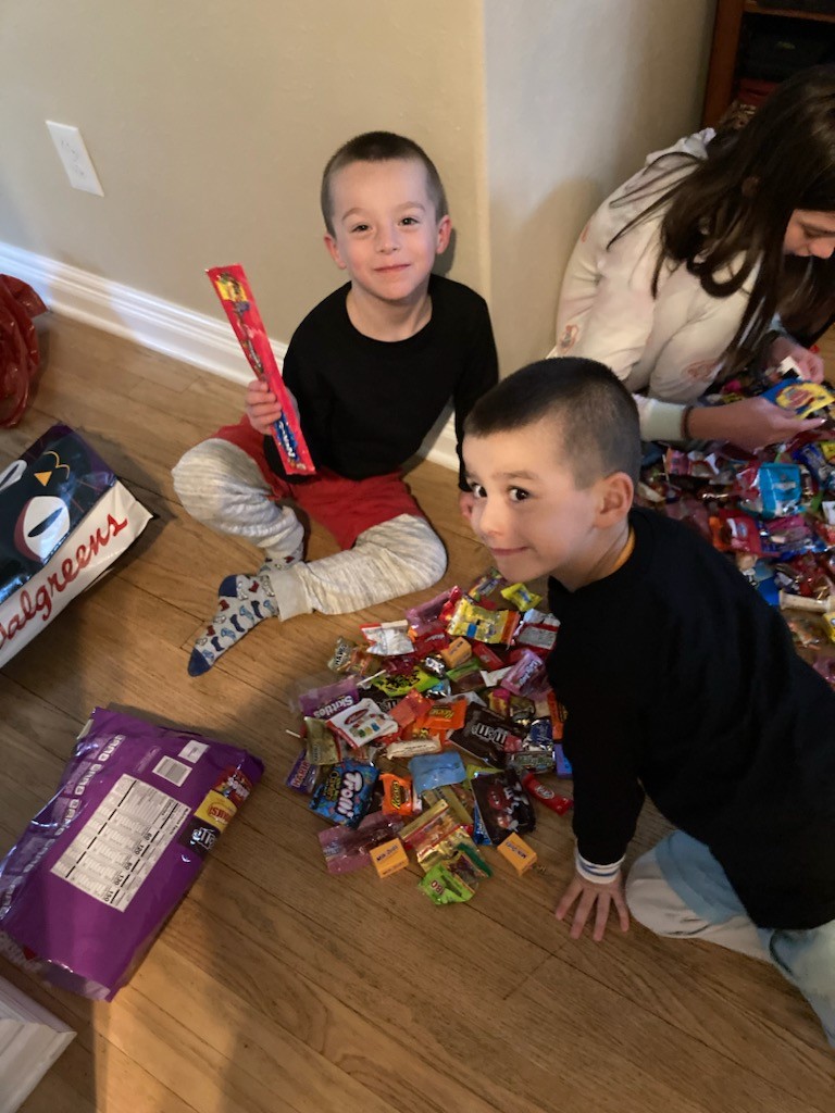 You guys had so much fun finally getting to wear your Cuphead and Mugman costumes for trick or treating today! I took you guys and Morrison out for a little while, then you two came in while I went back out with him for a little bit longer. Then Avit, you joined us for round 3, and your pumpkin was completely full!